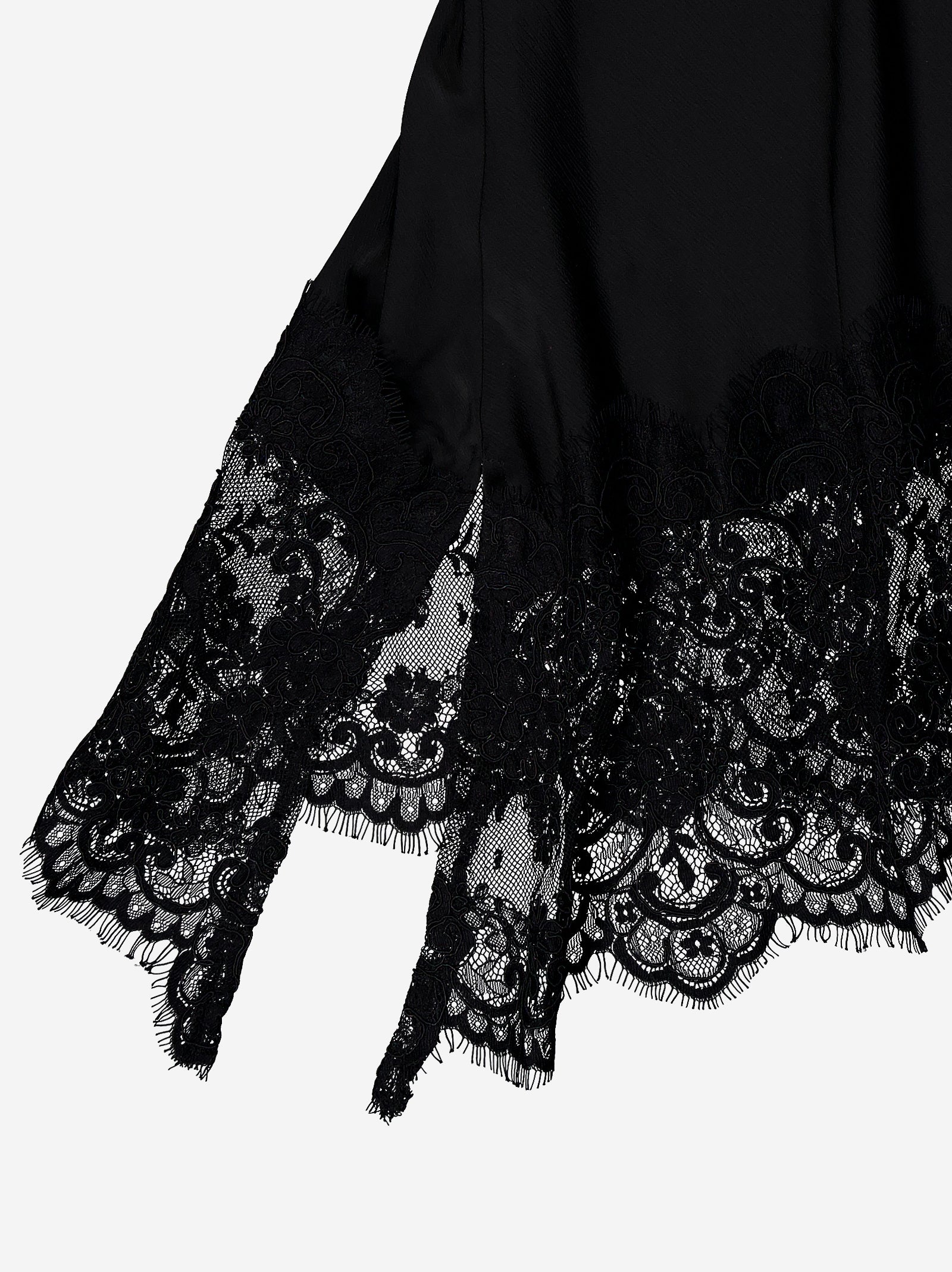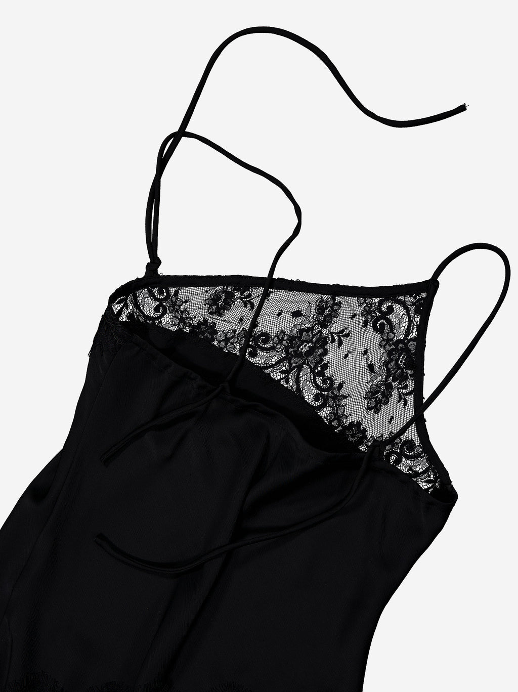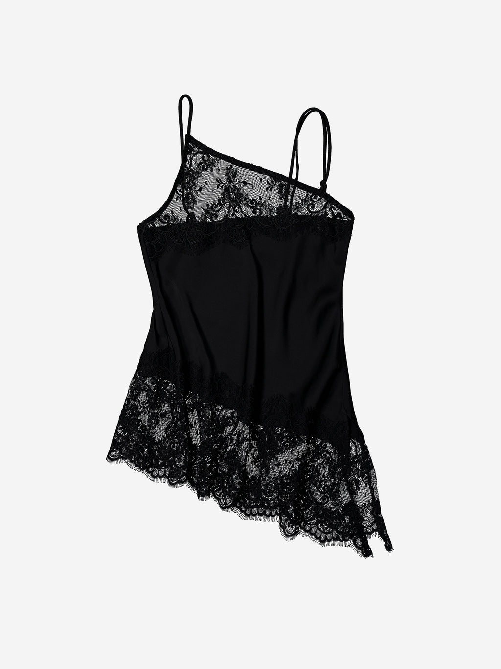 Top crafted from fluid black fabric with lace details that provide a delicate and sophisticated finish. It features thin straps and a semi-sheer upper panel that adds visual lightness to the design. The hem incorporates irregular-drop lace, reinforcing its feminine and refined character. A versatile garment that elevates any look, from more casual combinations to evening outfits. Materials: mixed fabrics.