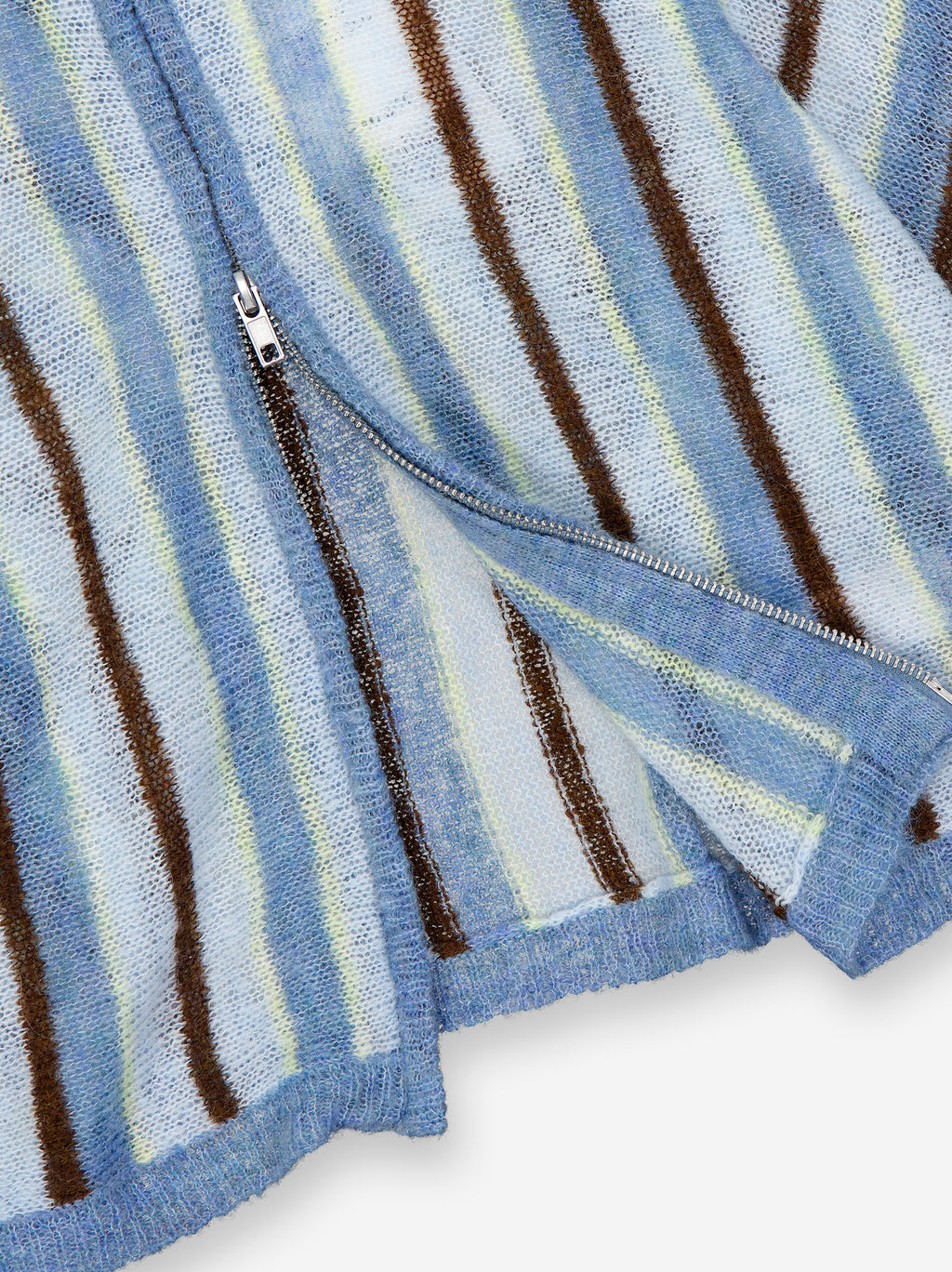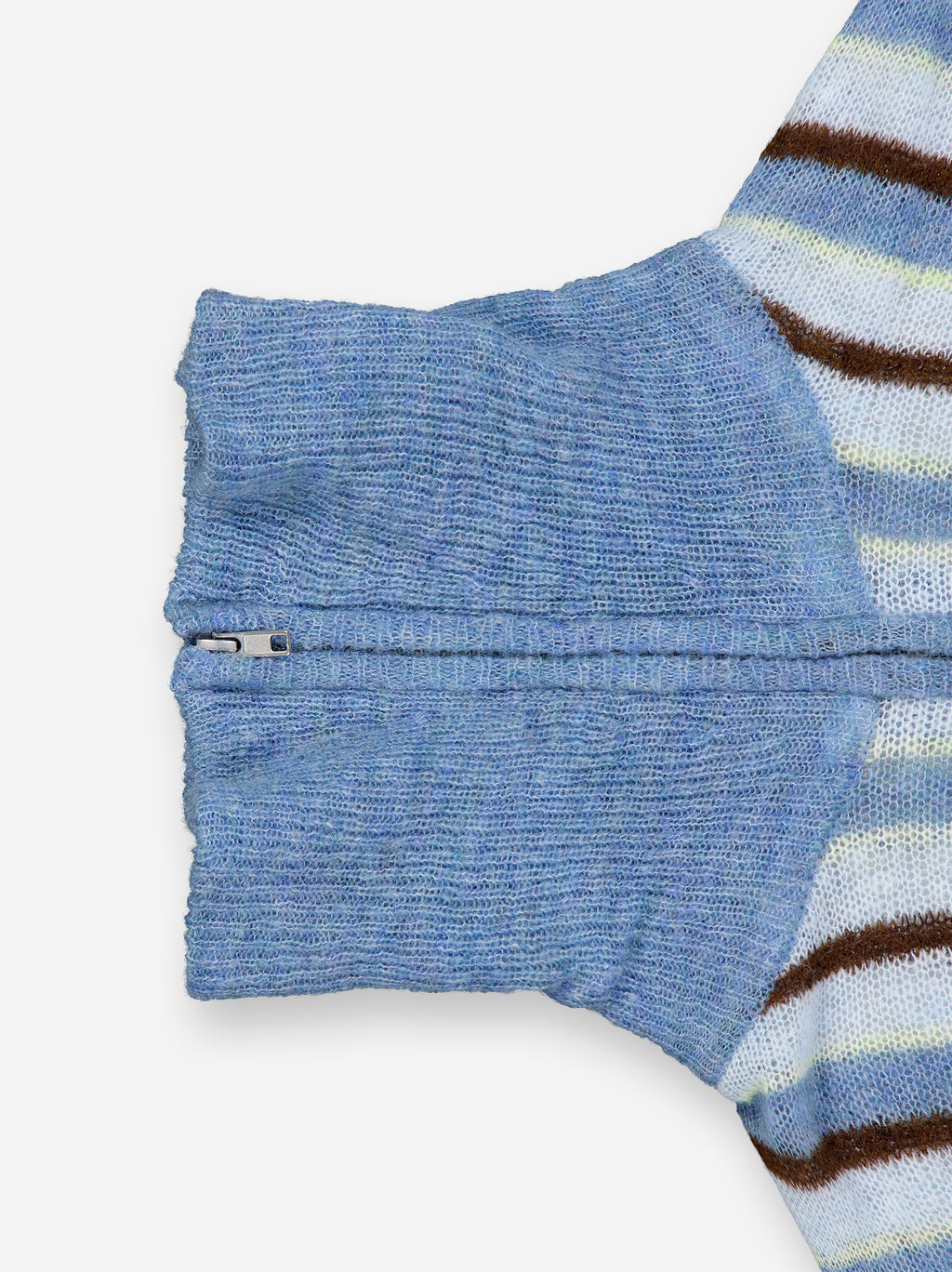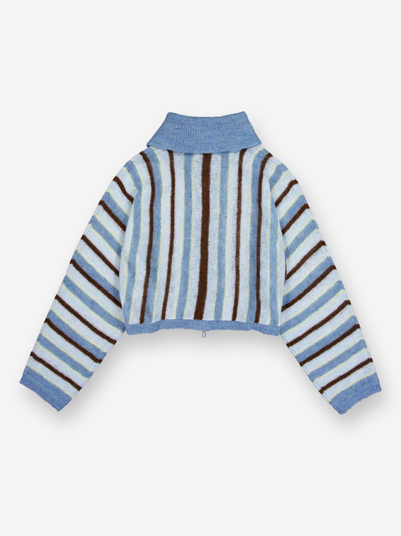Chaqueta cropped de corte relajado confeccionada en punto. Diseño de rayas verticales y cuello alto de vuelta o fold-over. Cierre de cremallera bidireccional. Acabados en bajo y puños con remate de canalé.