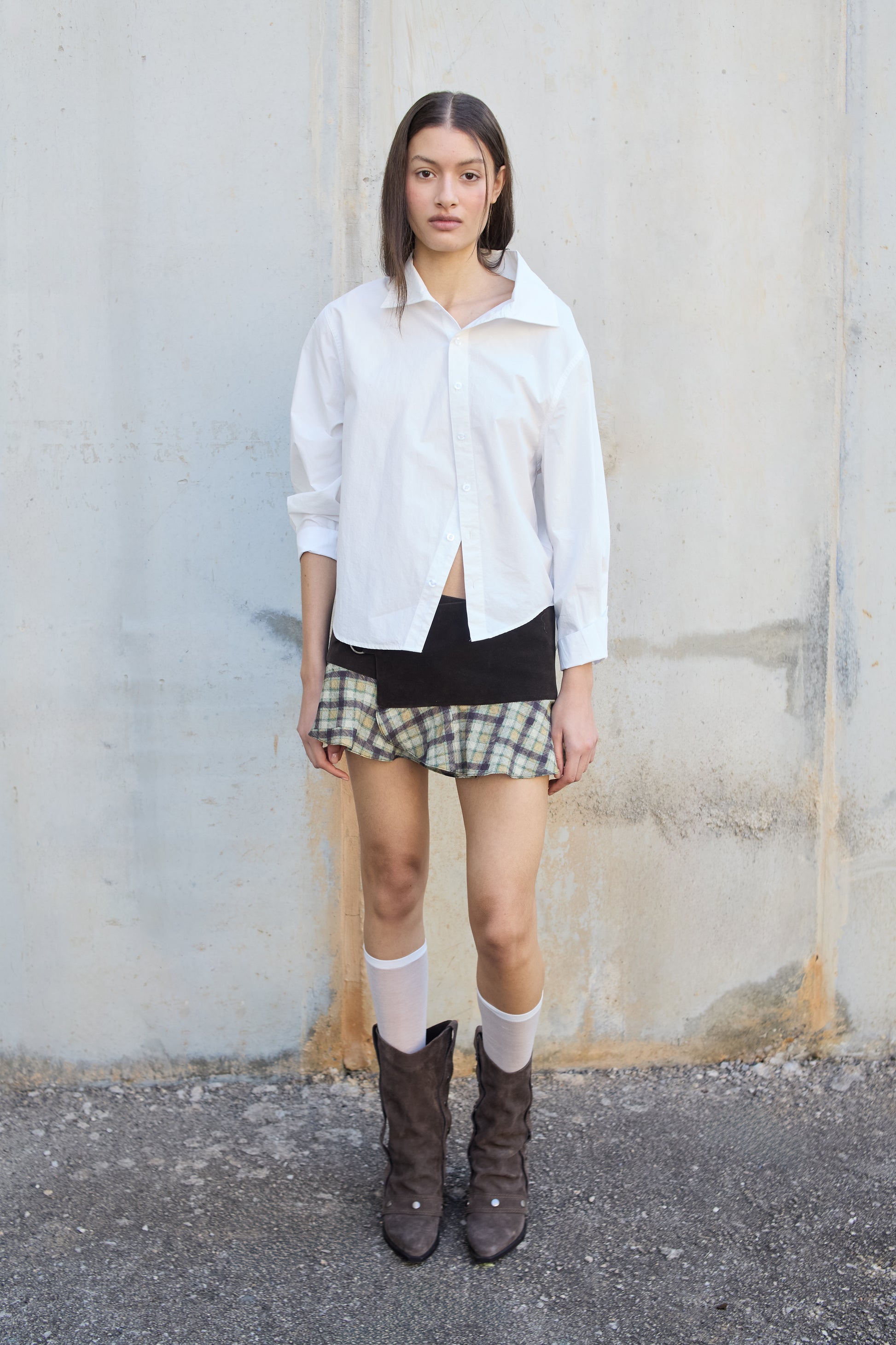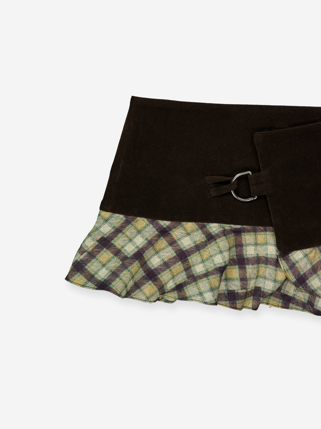 Falda mini low waist que destaca por su mezcla de texturas y su estética "Neo-Kilt". Estilo wrap (cruzado), asegurándose lateralmente mediante una hebilla metálica. Bajos rematados con volantes tartán. Inspiración Y2K.