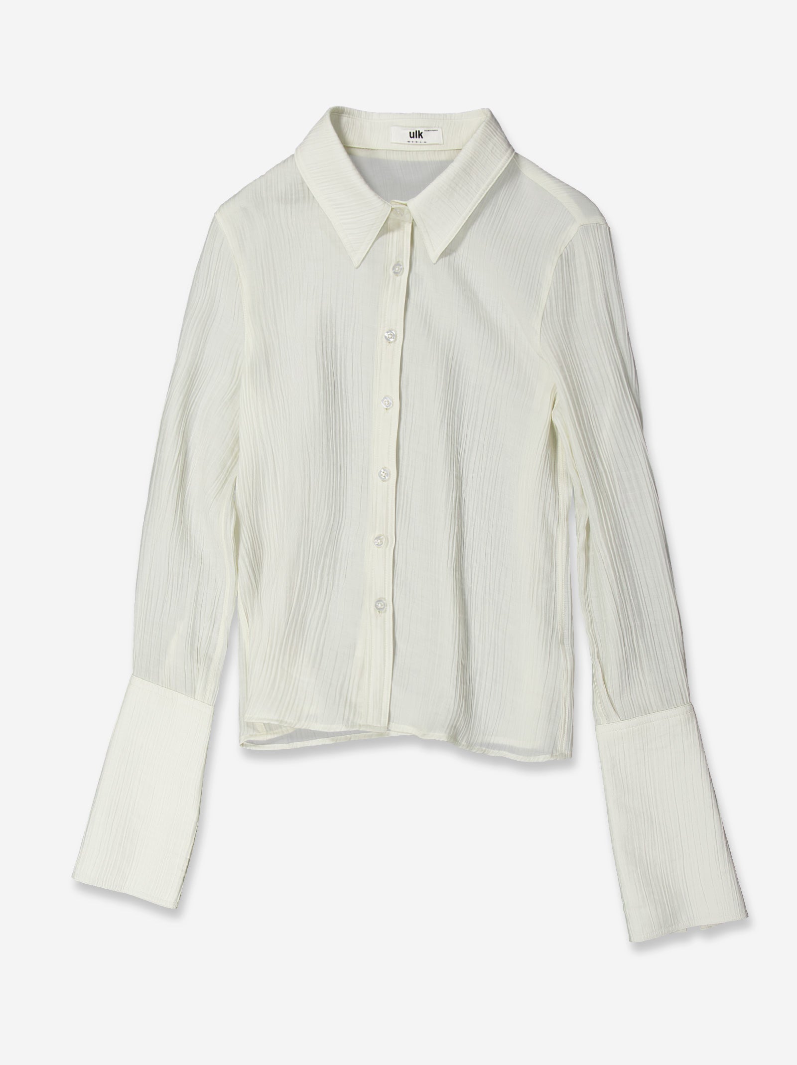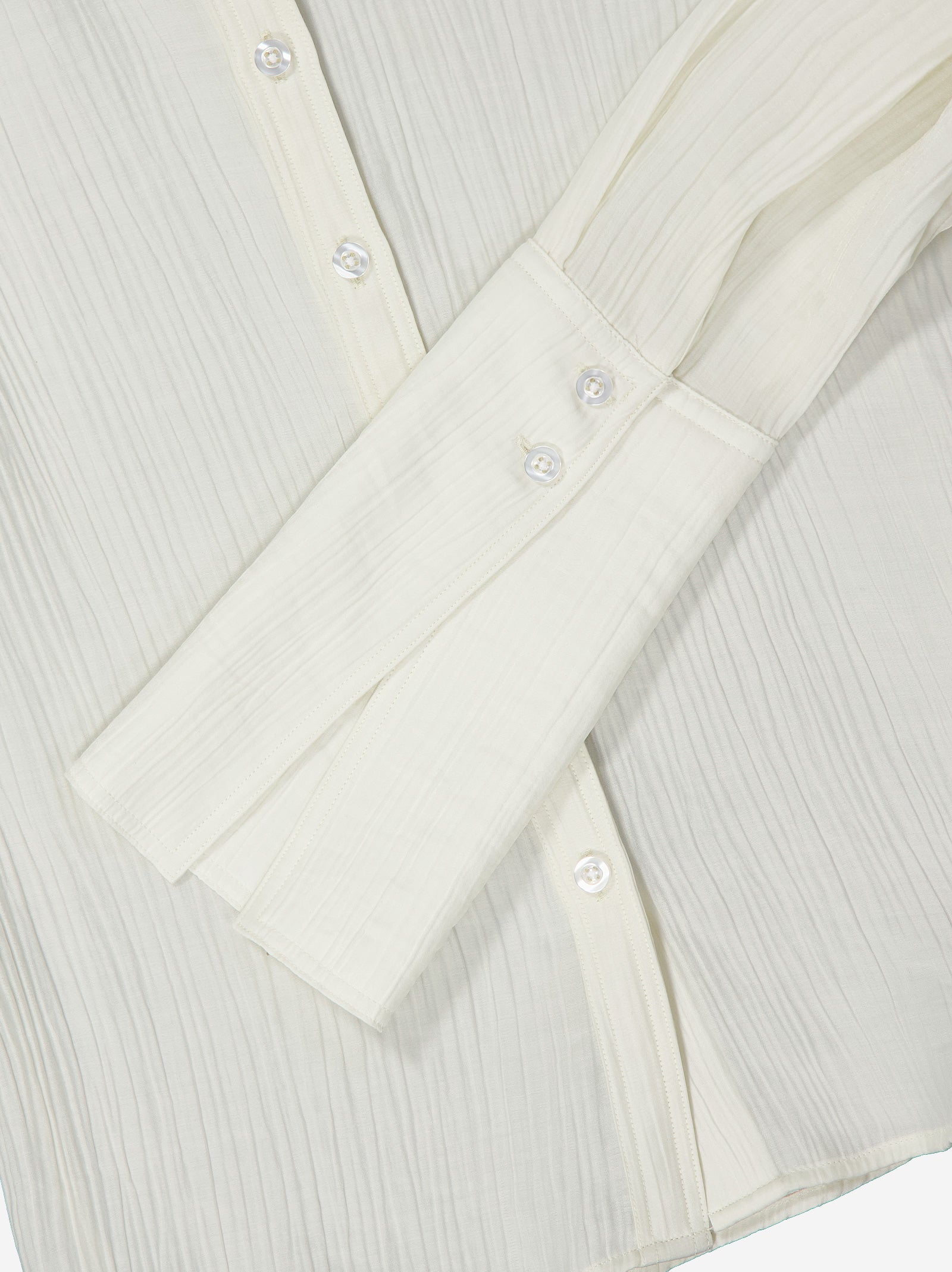 Shirt made of lightweight white fabric with a textured finish that provides a subtle visual effect. It features a classic collar, front button fastening, and long sleeves with wide cuffs that enhance its silhouette. Its clean and slightly fluid design makes it a versatile garment, ideal for both formal looks and more relaxed combinations. Materials: cotton blend.
