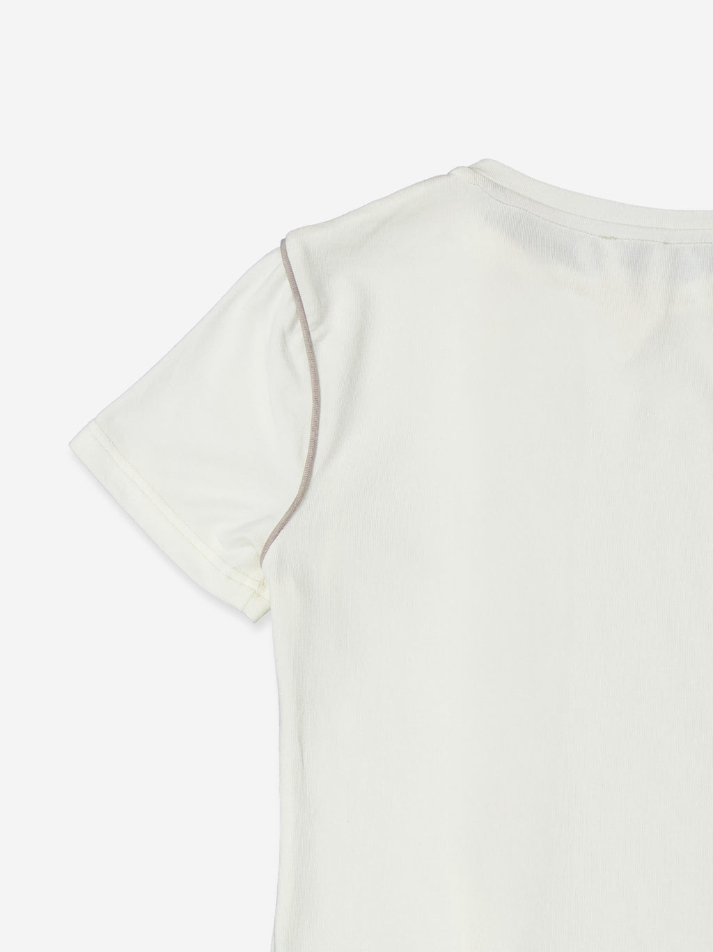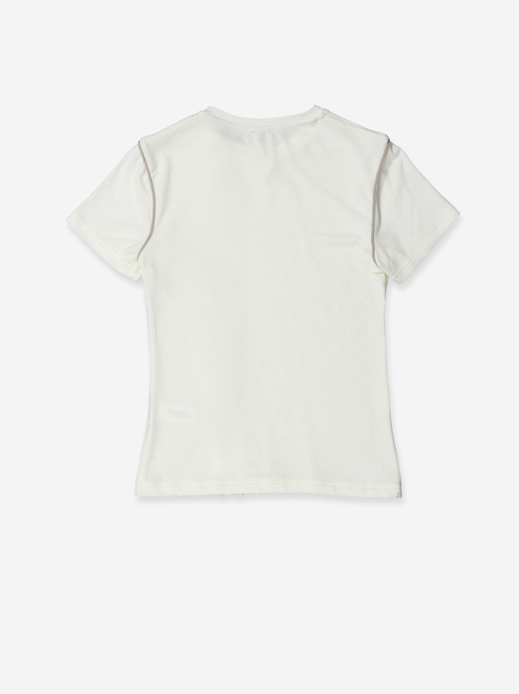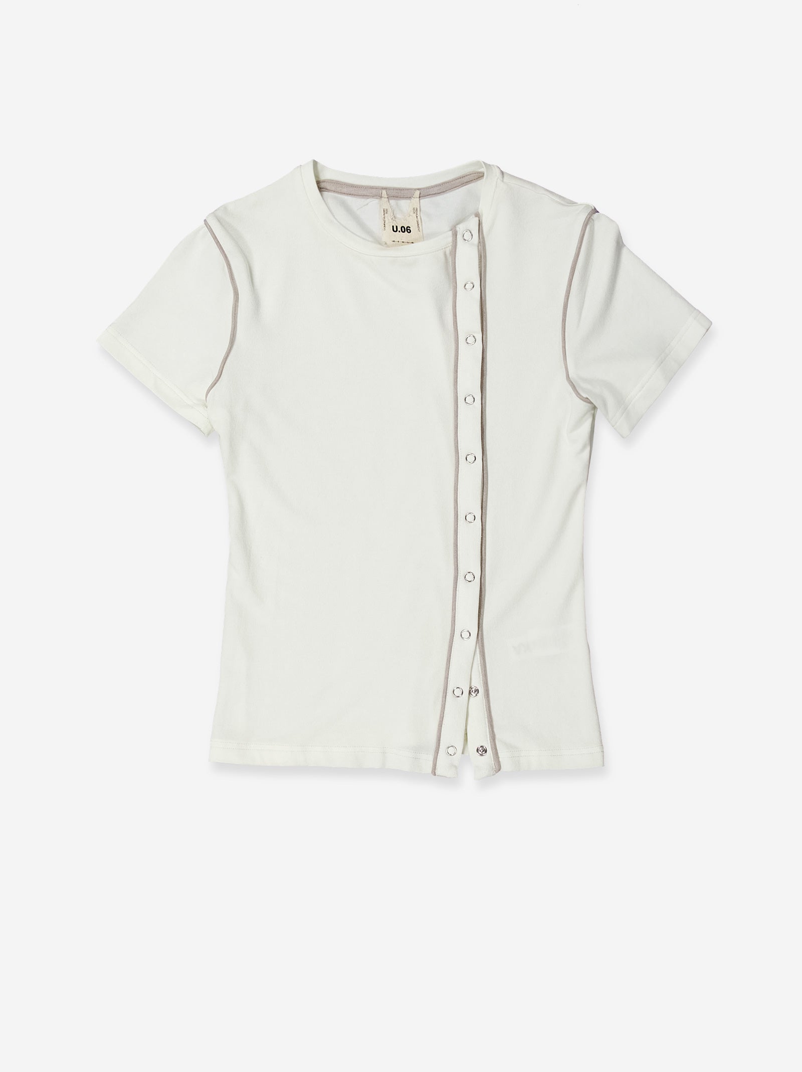White t-shirt with a clean design and details that provide a distinctive finish. The front features a line of snap buttons accompanied by a contrasting trim that subtly frames the silhouette. Its slim fit and the visual cleanness of the color enhance a luminous aesthetic, easy to integrate into neutral looks or more elaborate combinations. Materials: cotton blend.