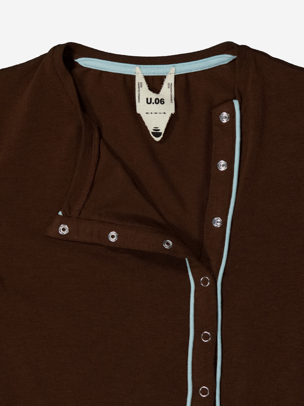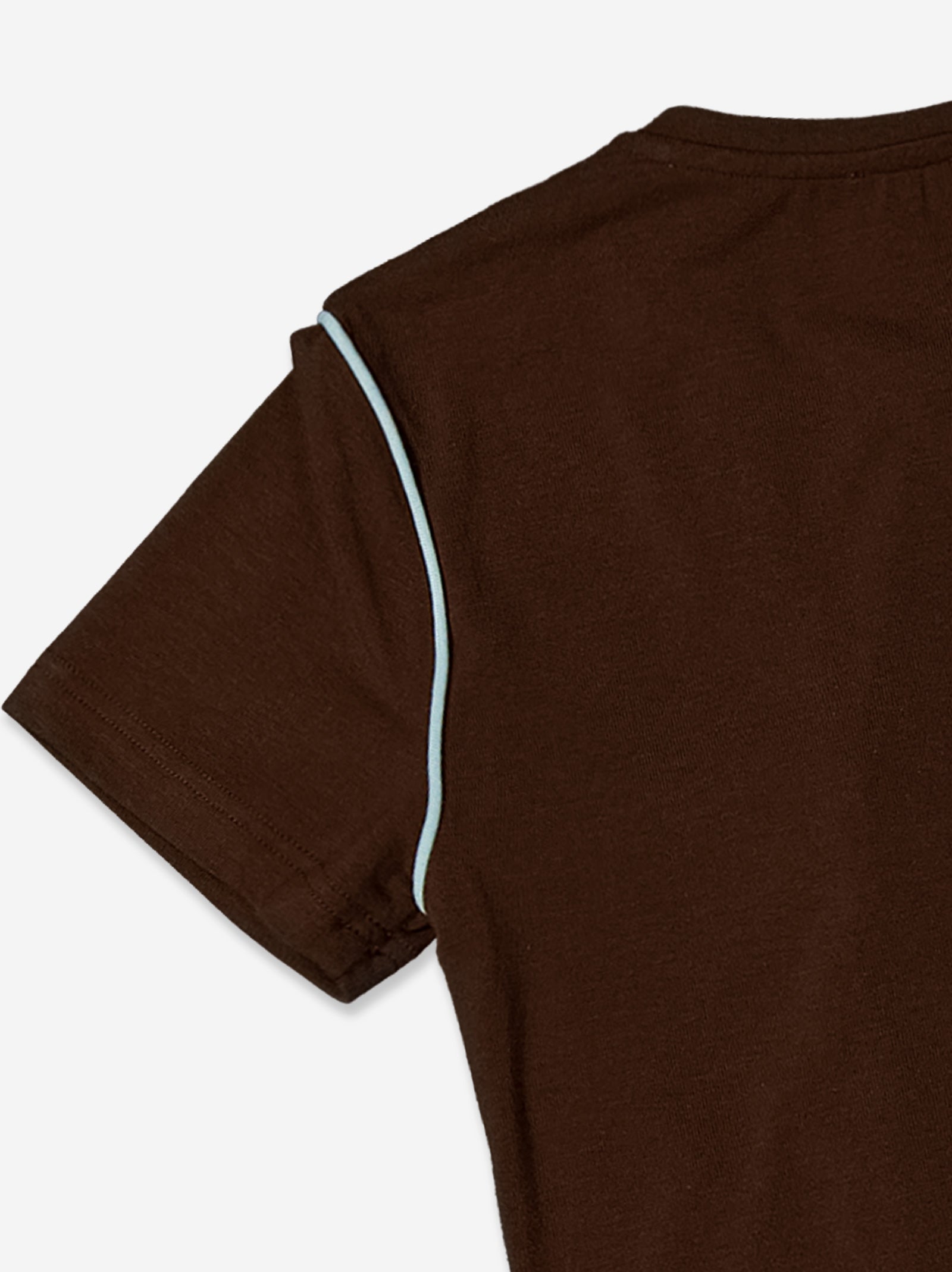 Short-sleeved brown t-shirt with a design that plays with contrast. It features light-colored piping that runs along the shoulders and front, framing the garment and providing a distinctive visual effect. The front snap closure adds a functional and decorative touch, while its fitted silhouette enhances a modern and defined look. A garment with character to elevate everyday outfits.