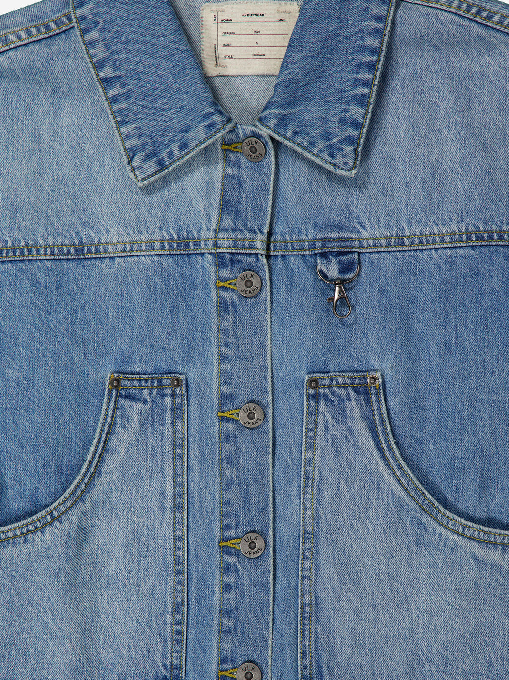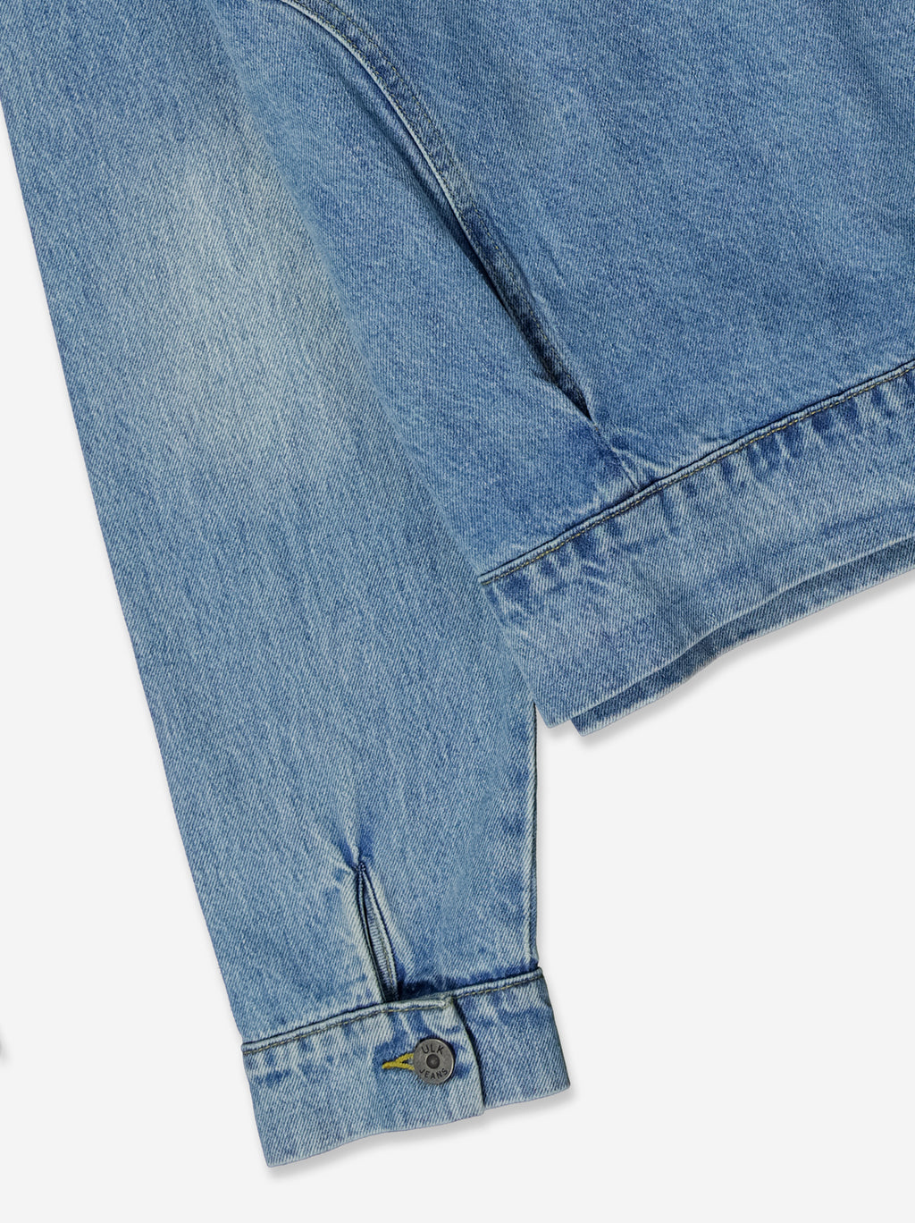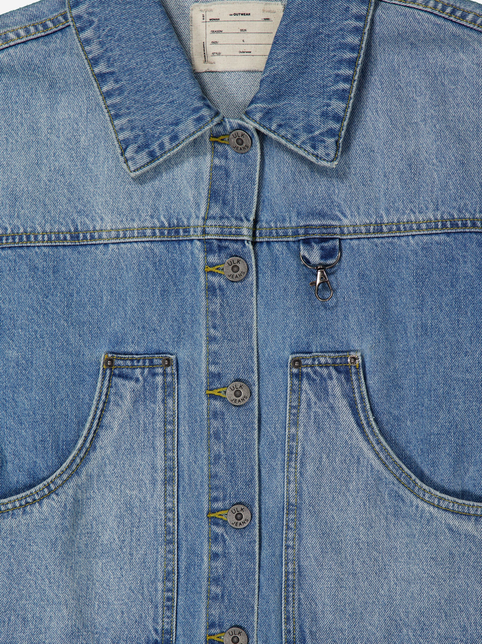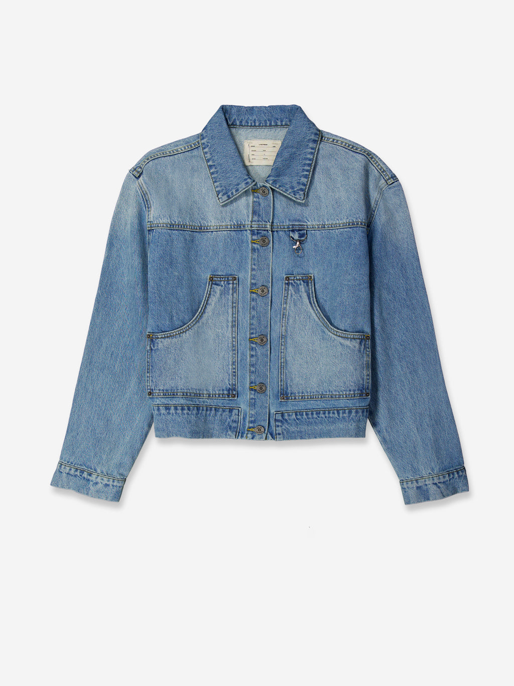 Cropped denim jacket in a medium blue wash, with a structured and modern design. It features a front button closure and two large front pockets that provide functionality and a utilitarian touch. The slightly distressed finish enhances the denim character of the garment, while its short silhouette makes it ideal for pairing with high-waisted items. A revamped basic that easily fits into stylish casual looks.
