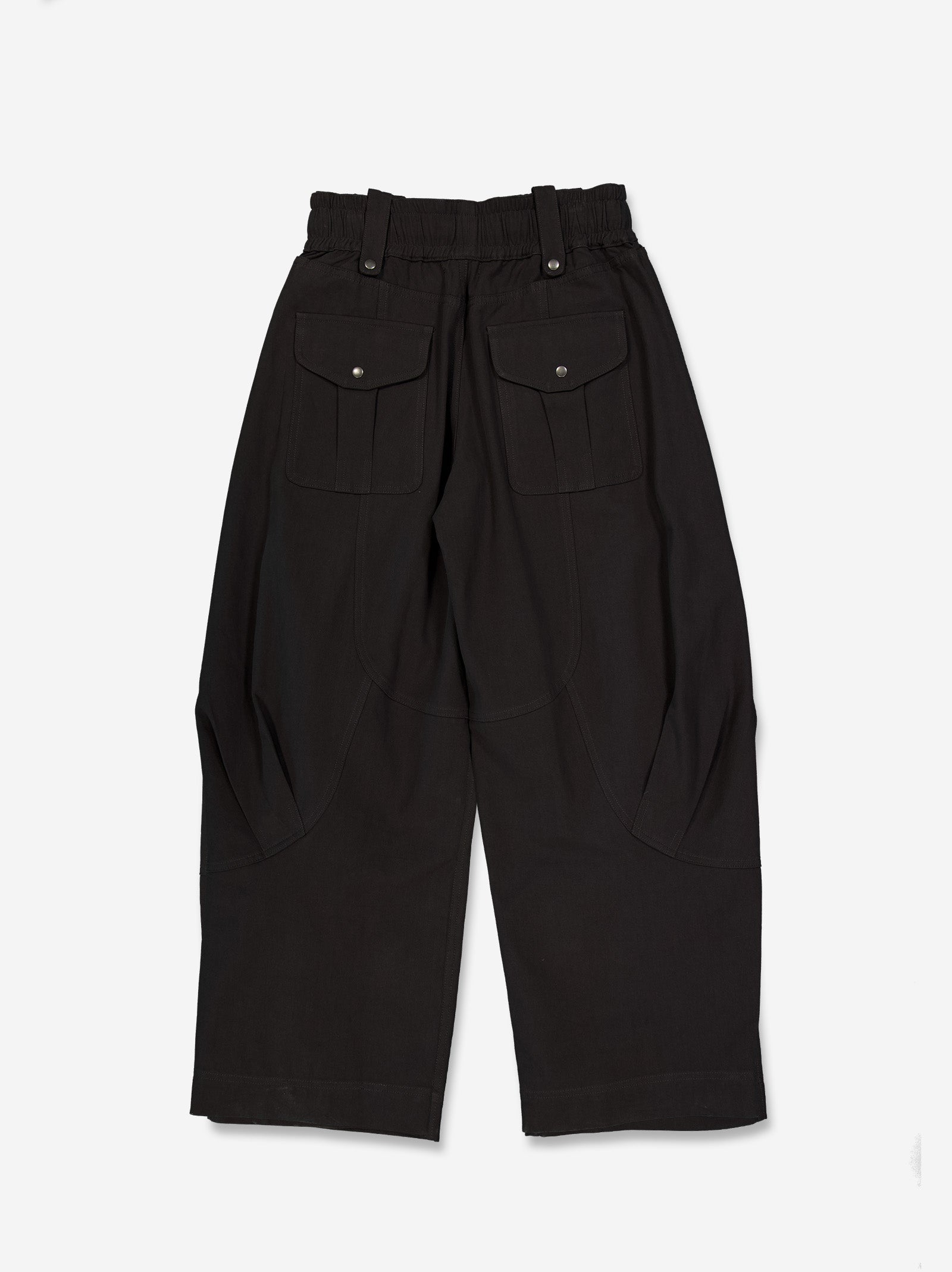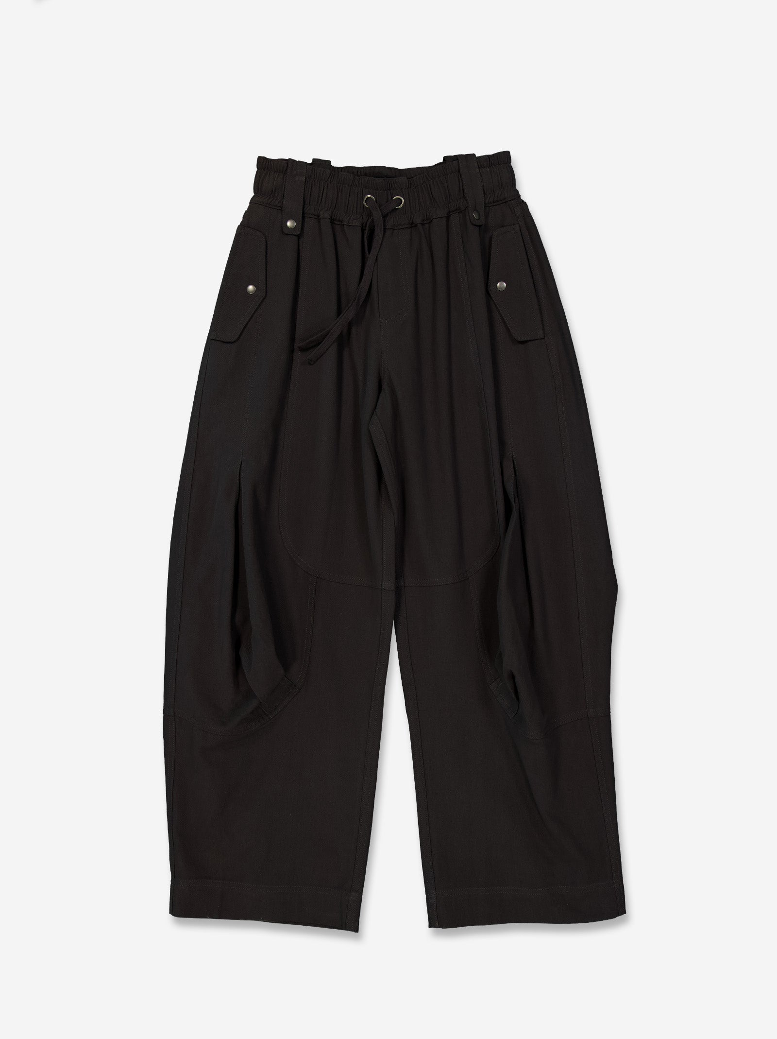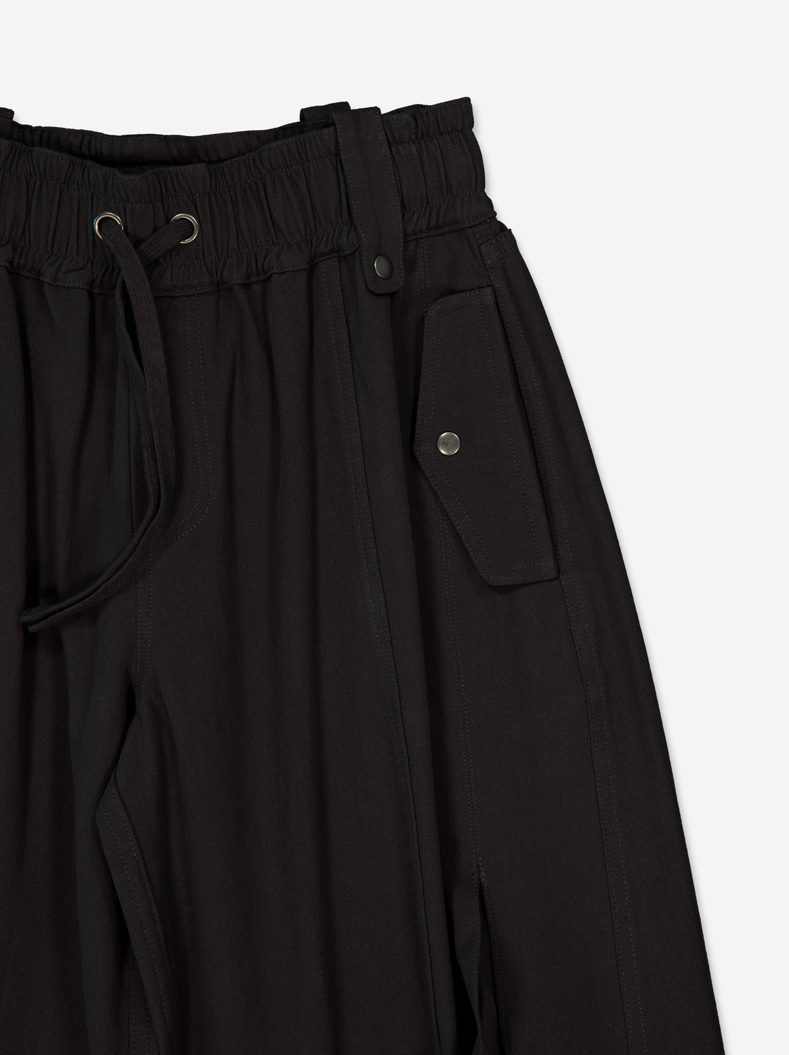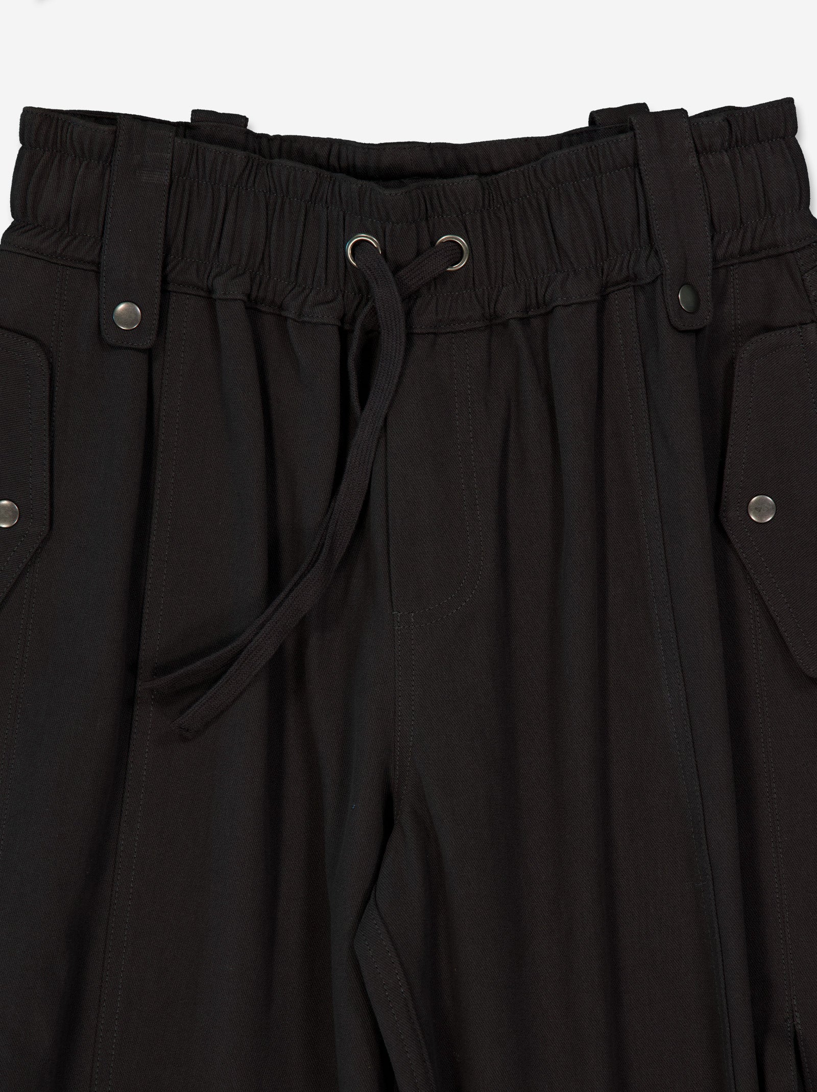 Technical/utility jogger pants with a relaxed fit. Elastic waist with drawstring and metal rivets for an industrial look. Features side pockets and a draped design. Flap back pockets. Avant-garde, comfortable, and urban garment.