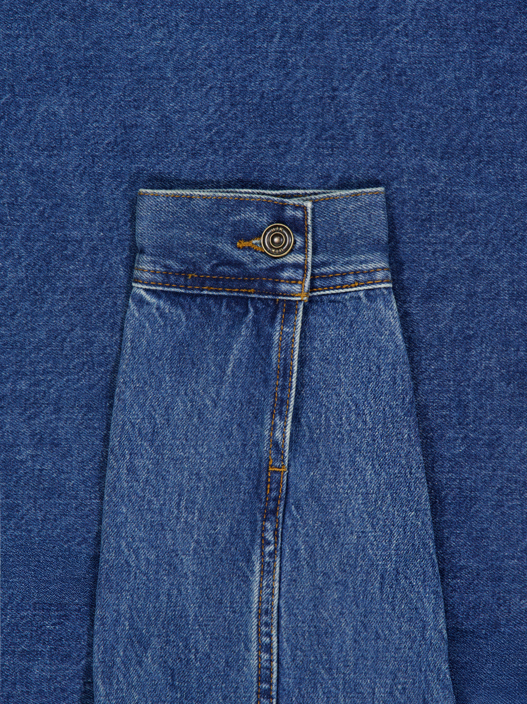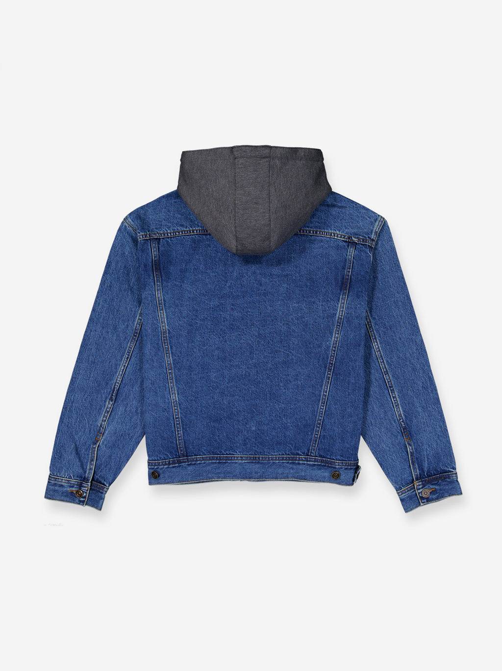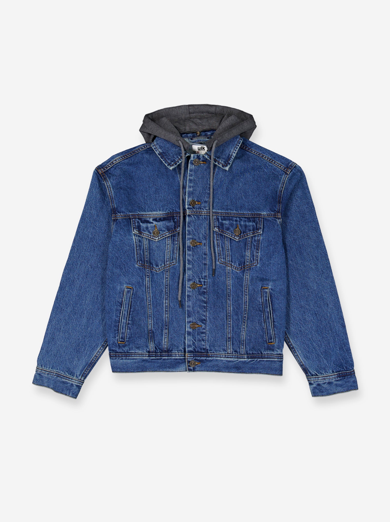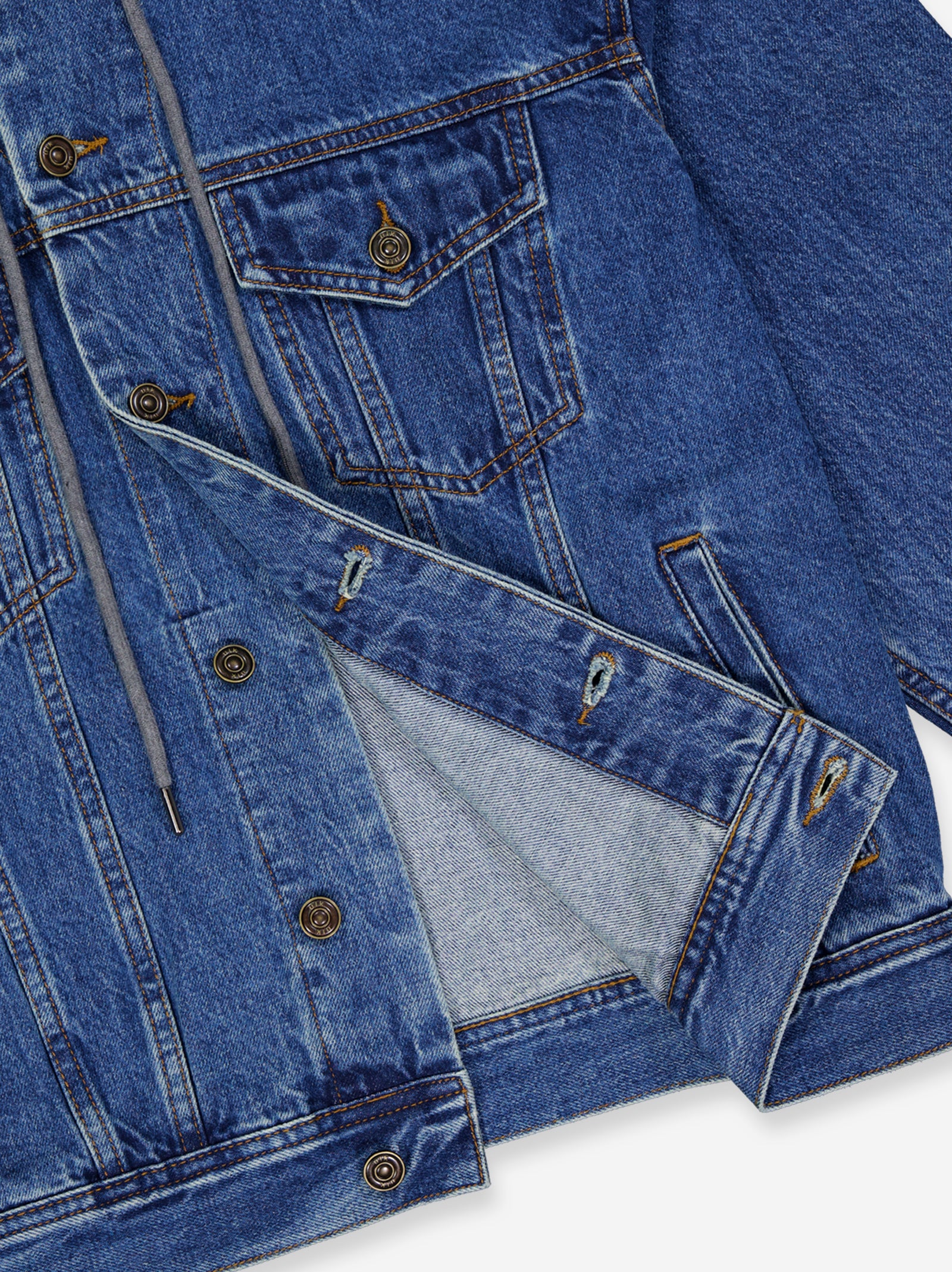 Chaqueta vaquera con capucha que ofrece la versatilidad de dos estilos en uno. Confeccionada en denim azul. Cierre frontal abotonado y cuatro bolsillos funcionales para un look urbano y moderno.
