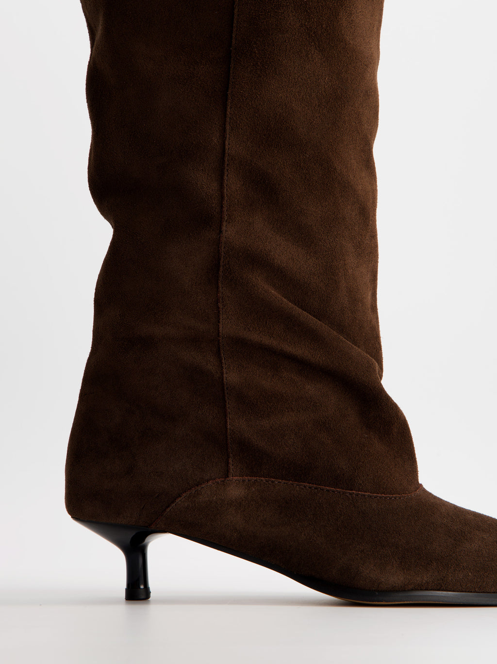 Wide-shaft suede boot. 3 cm kitten heel. Pointed toe.