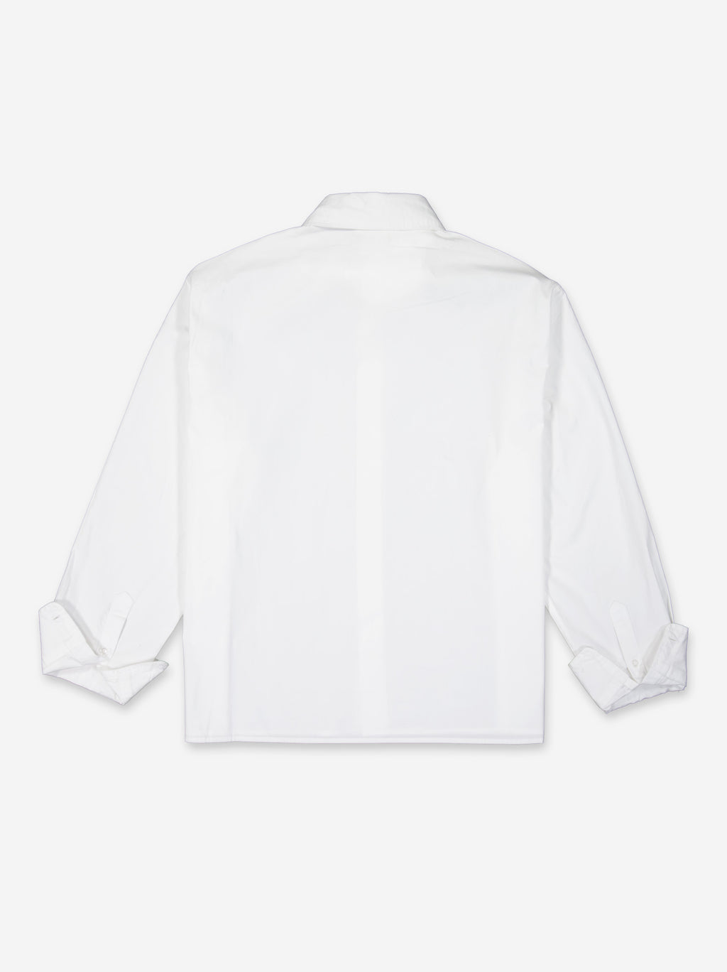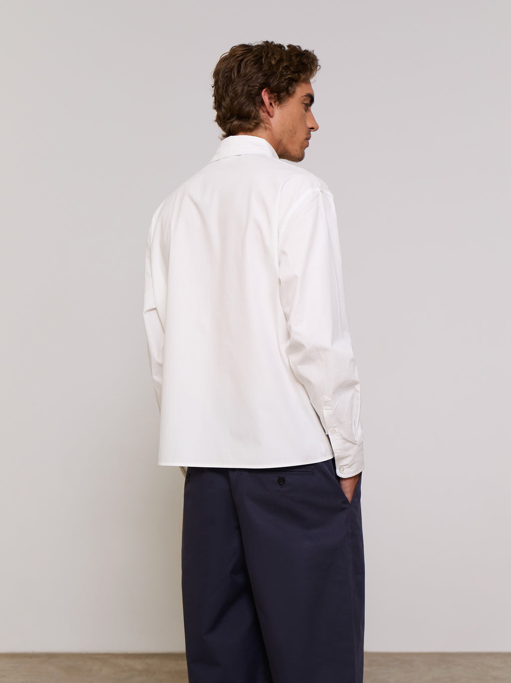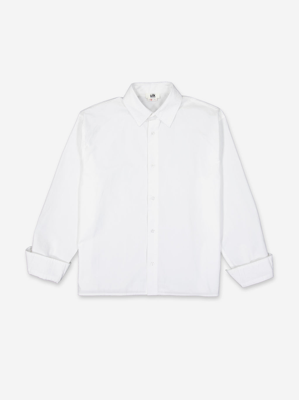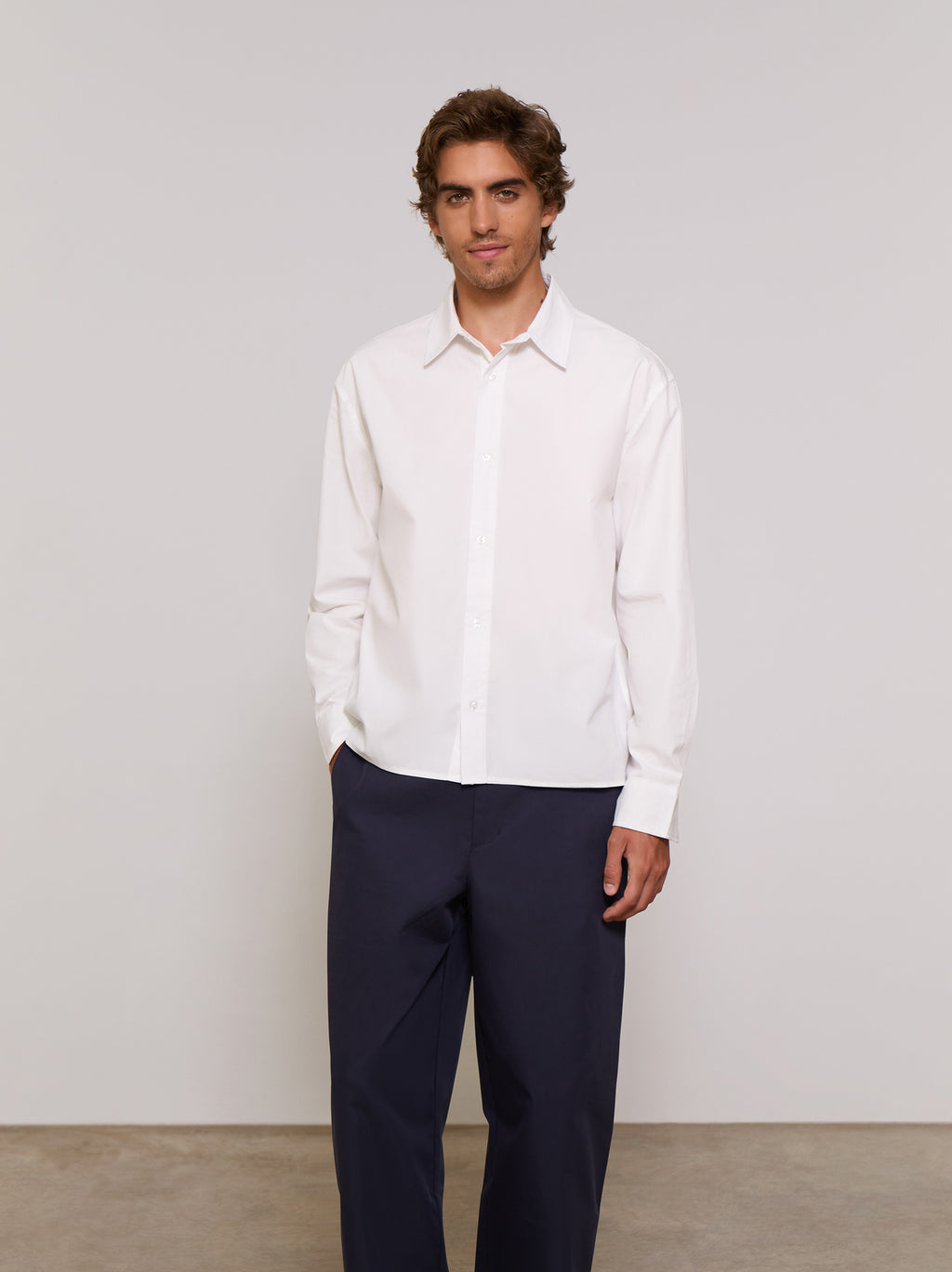 Regular-fit white shirt. Open collar and long sleeves with buttoned cuffs. Front button closure.
