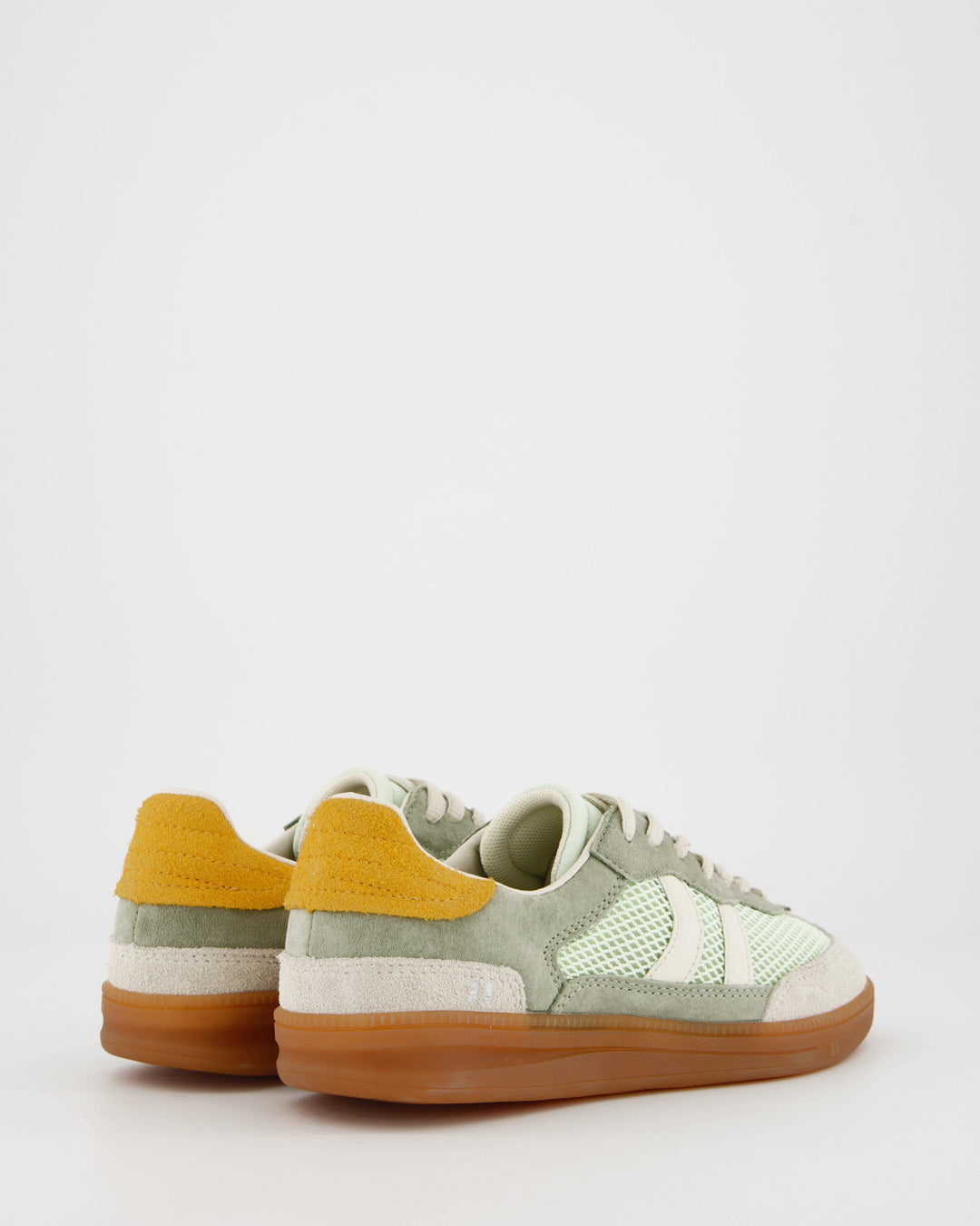 Low-top sneakers inspired by indoor soccer. Upper made of suede leather combined with mesh-effect nylon. Lace-up closure and lightly padded heel with multiple stitching made of contrasting suede leather. Thin rubber and gel sole. The gel is visible on the sole, as it is located internally in the heel to improve cushioning.