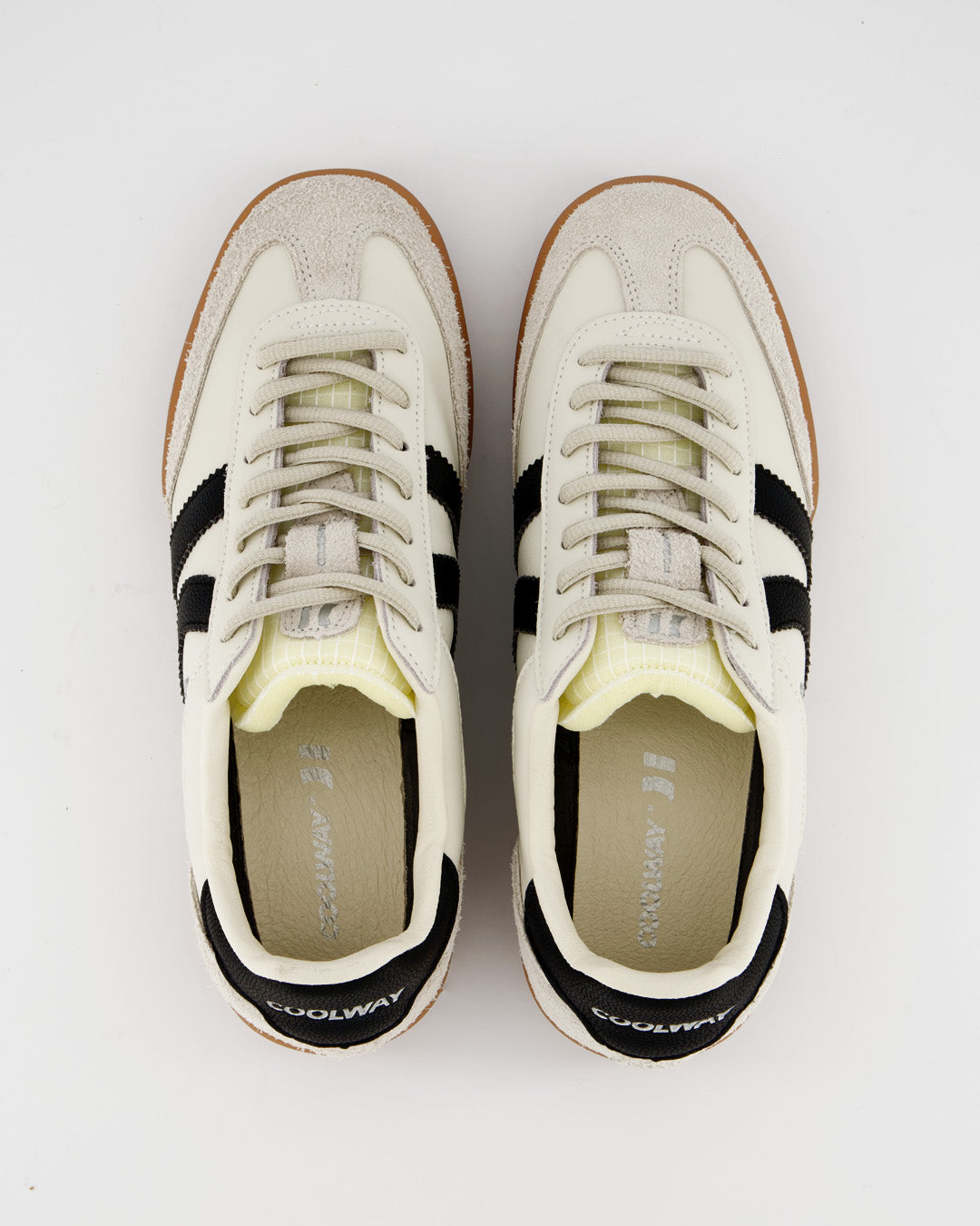 Sporty sneaker combining leather with suede and contrasting color details. Semi-transparent, foam-padded tongue with visible upper. Leather lining visible. Interchangeable two-tone oval laces. Lightly padded collar. Flexible rubber sole for durability and grip with gel inserts on the sides and back. The "GRASS" model name is embossed on the side in silver.