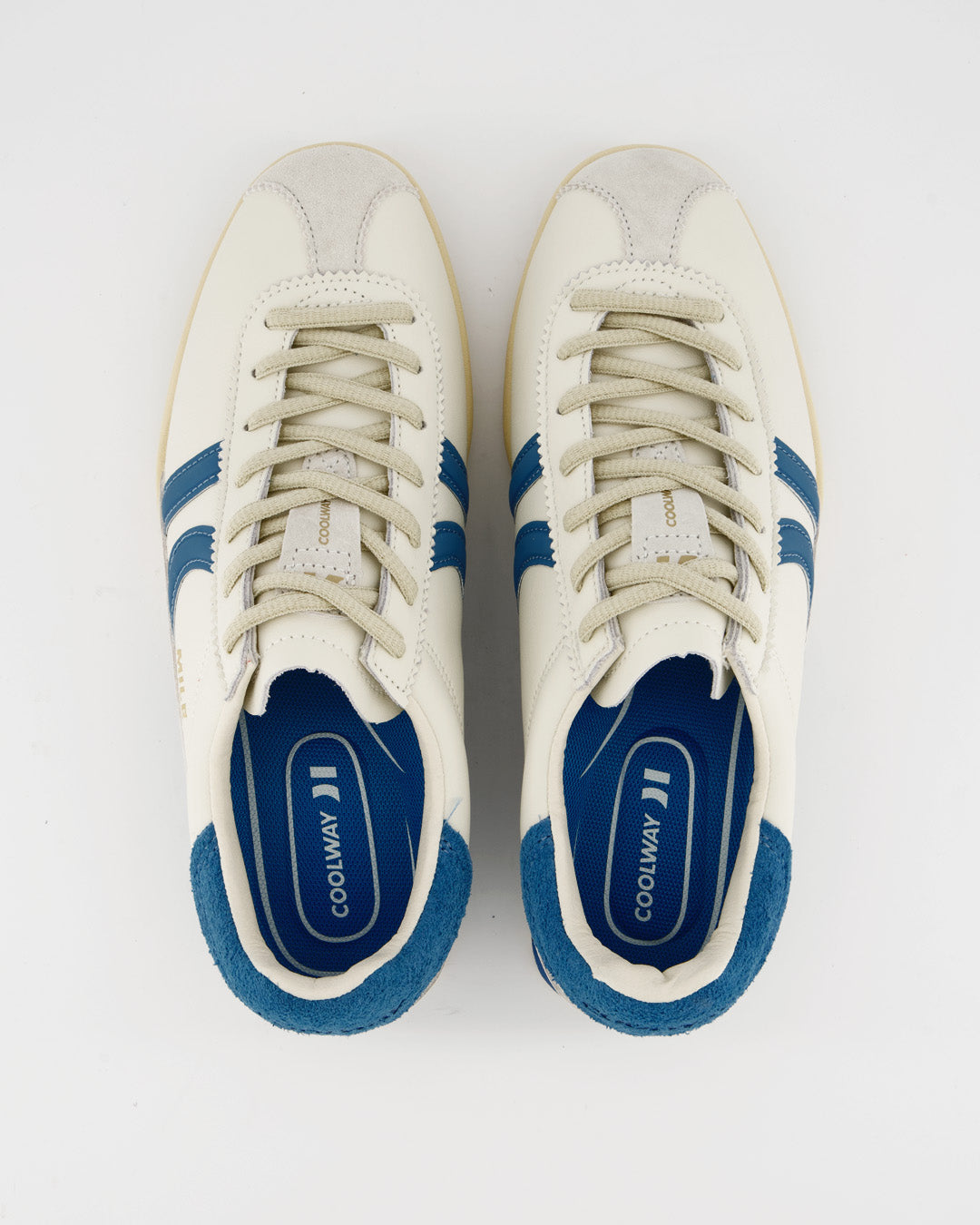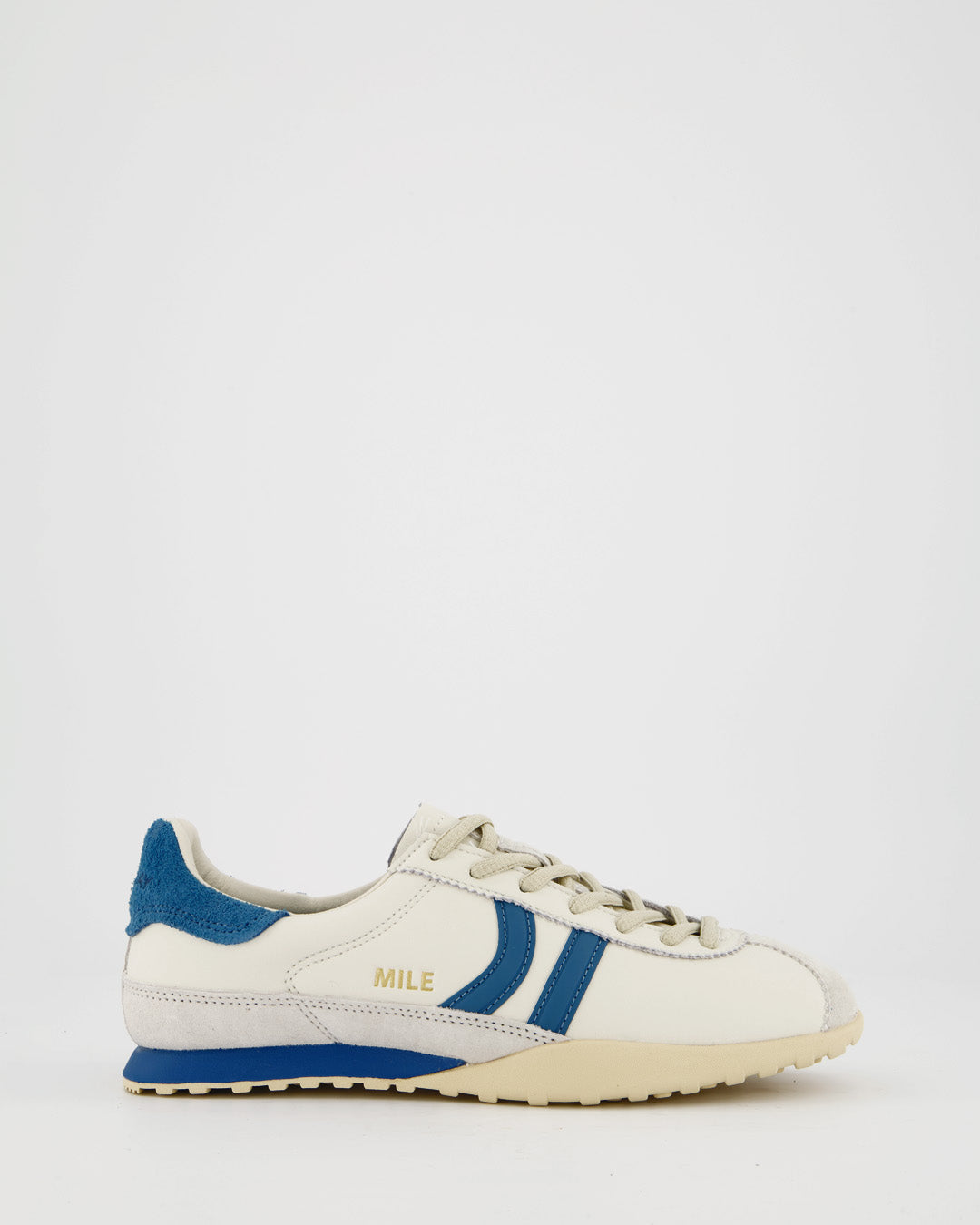 Retro-style sports shoe with a thin sole that combines nylon fabric with leather and contrasting colour details. Semi-transparent sports fabric tongue padded with foam visible on the upper. Leather lining views. Interchangeable two-tone oval laces. Lightly padded collar. Flexible rubber/rubber sole that provides durability and grip and phylon midsole that provides lightness and comfort. It features the name of the model “MILE” on the side in old gold.