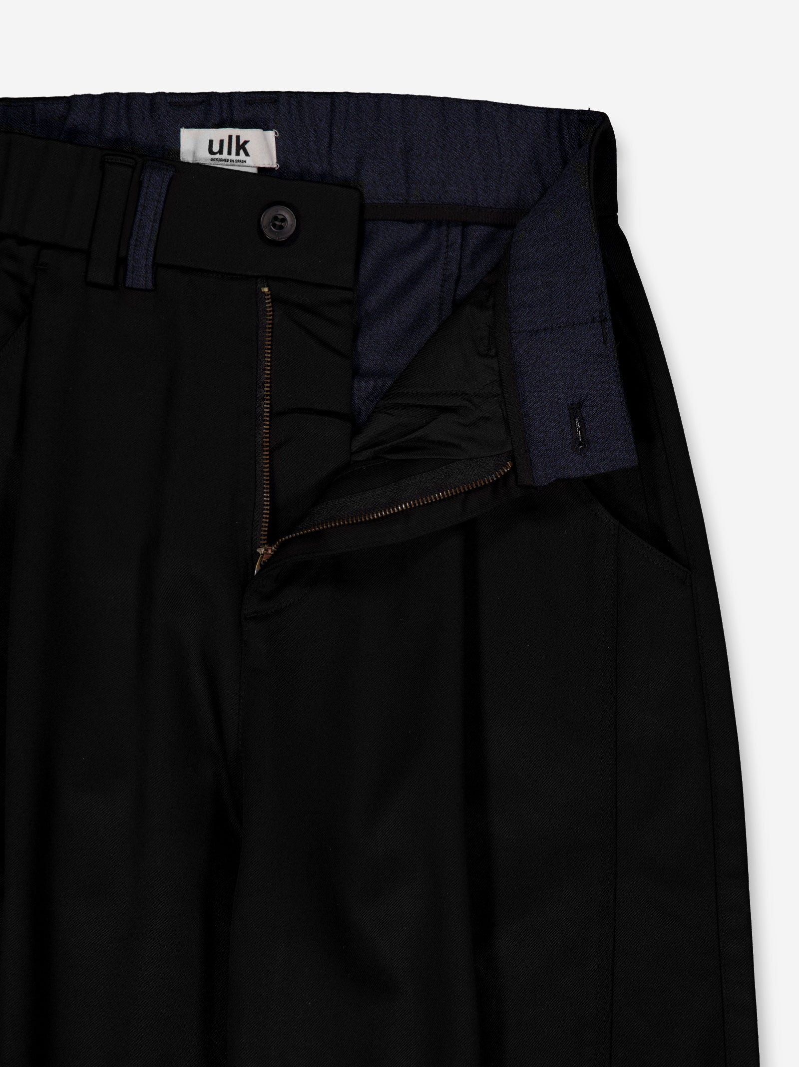 Pantalones negros de corte relajado con silueta moderna y cómoda. Cintura elástica trasera y pinzas frontales. Prenda versátil con detalles funcionales. Ideal para un estilo urbano y casual.