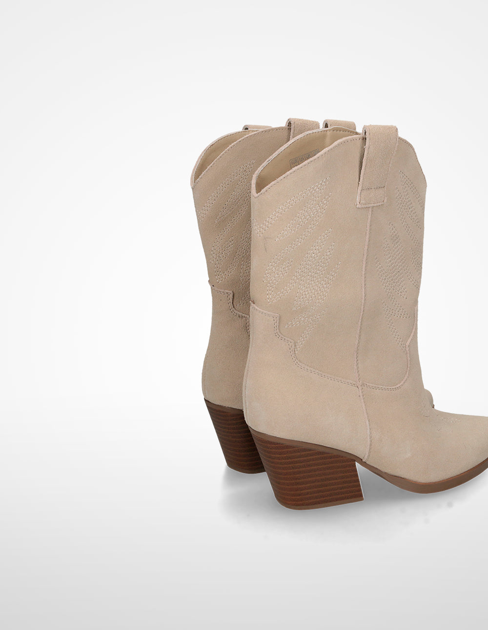 Beige cowboy-style ankle boots. Made of premium leather. 7 cm heel, 19 cm shaft. Embroidered detail, side pull tabs.