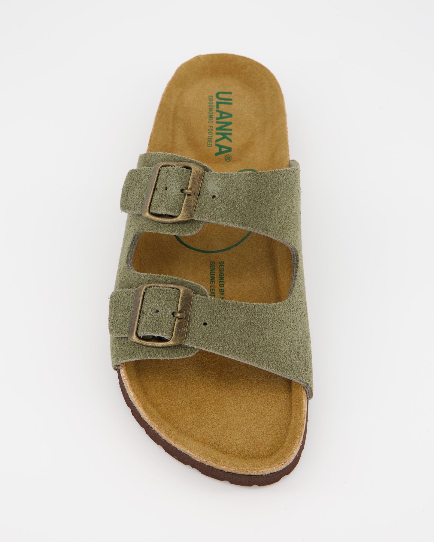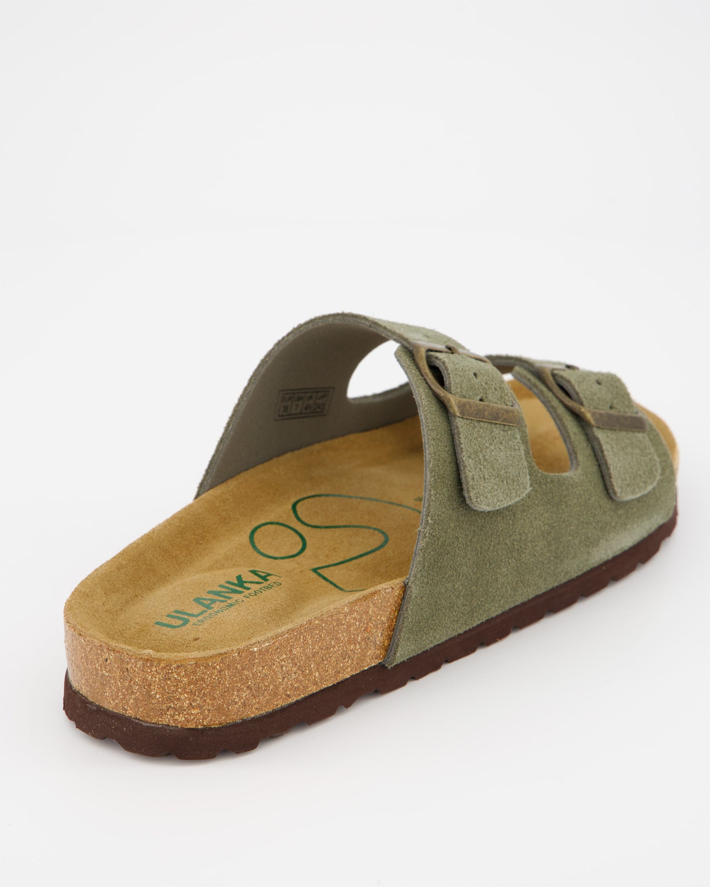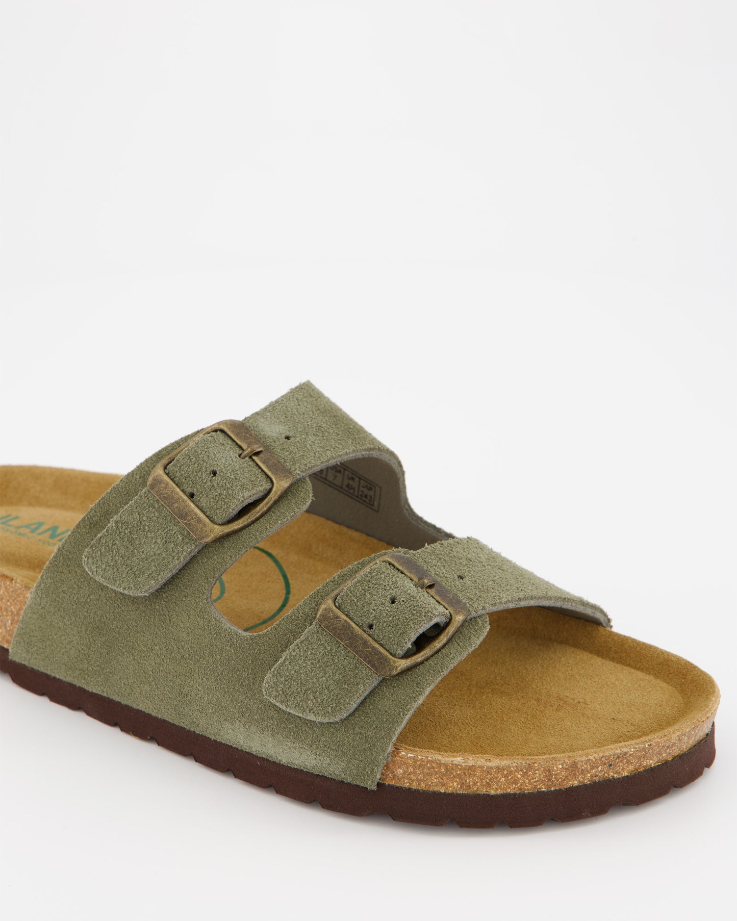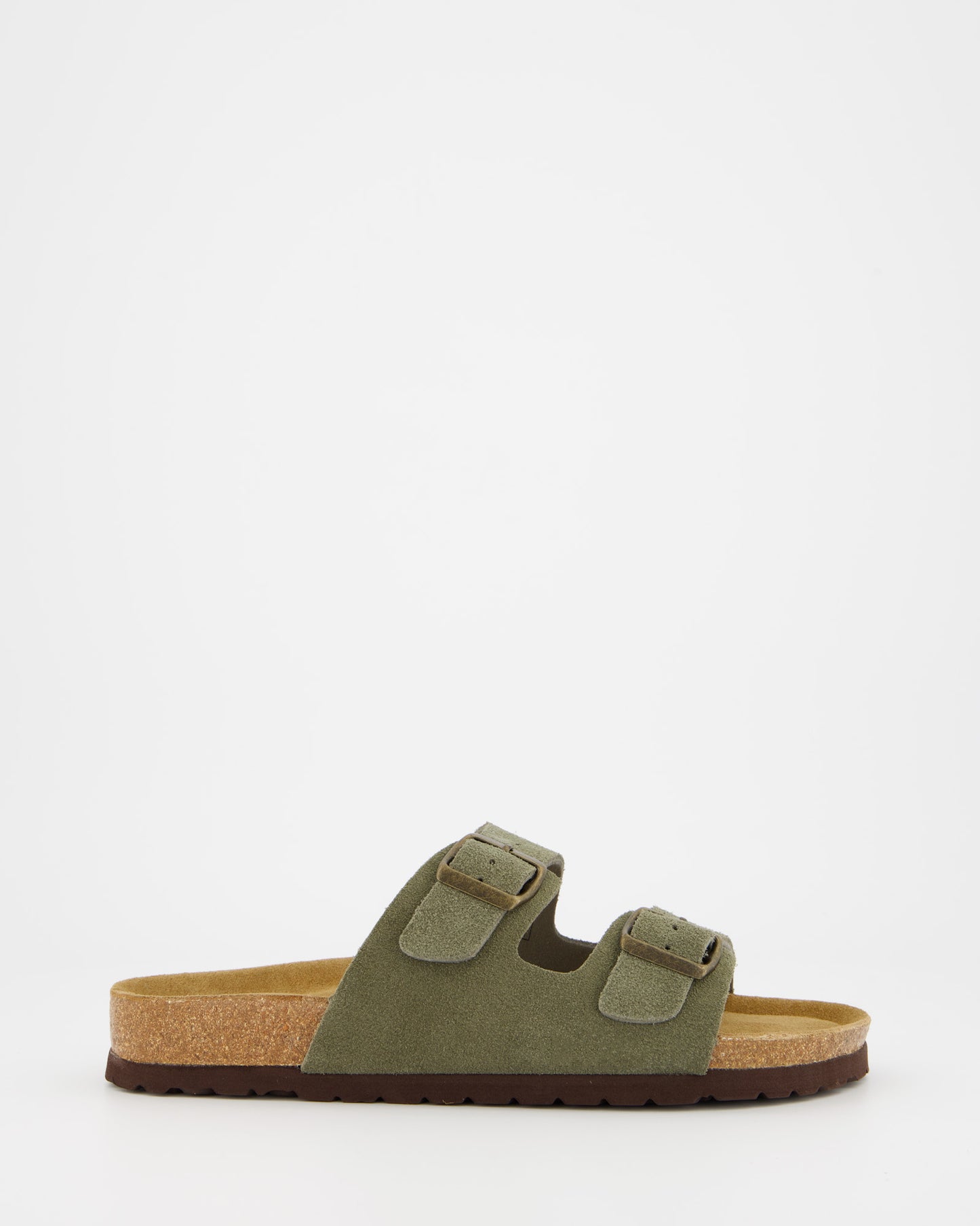 Sandals made of leather and synthetic materials. Adjustable buckle closure. 100% recycled anatomical insole. Suede upper. 3 cm high rubber sole.