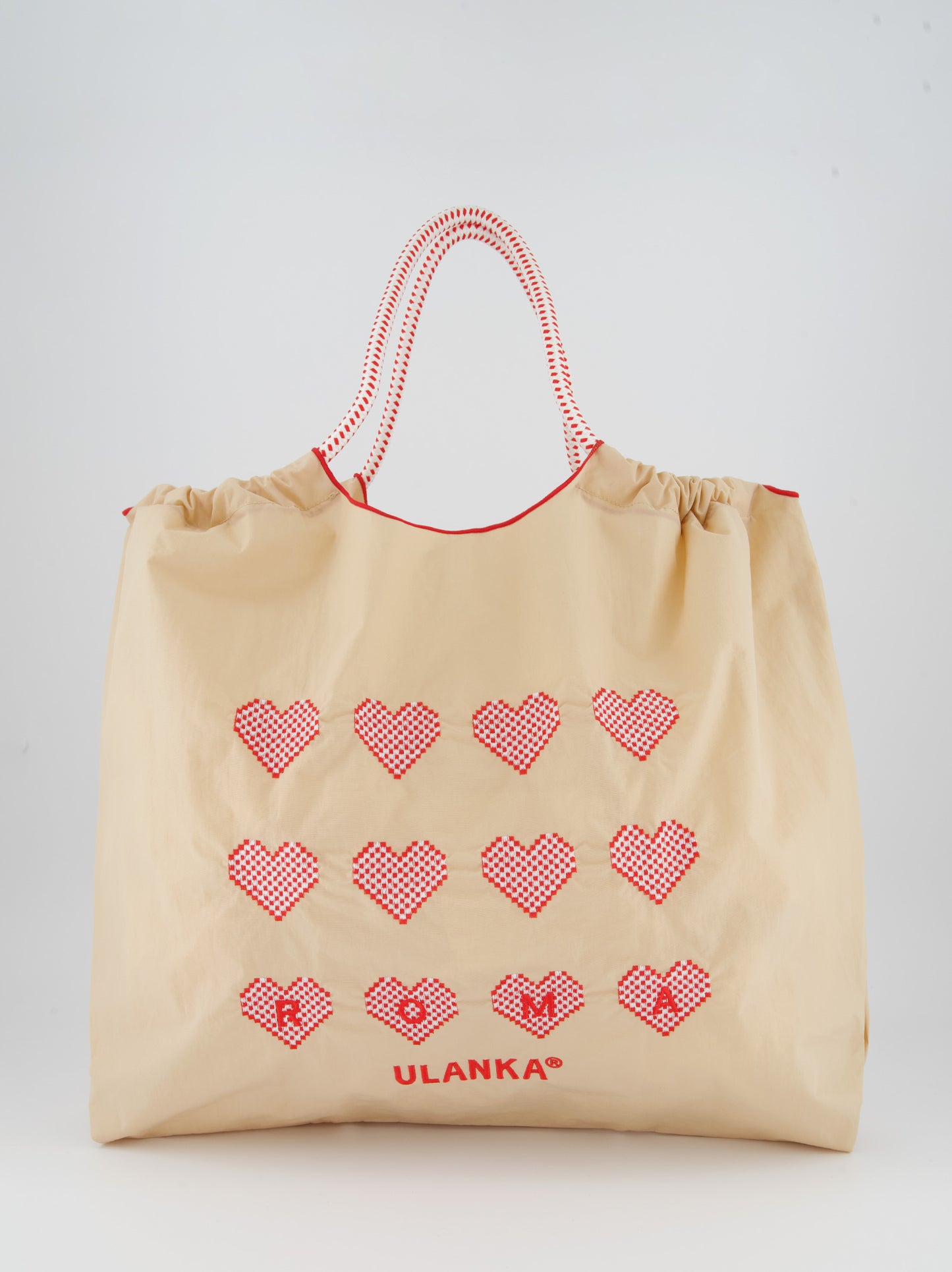 Bolso tote con bordados. Asa ajustable. Charms incluidos. Medidas 60x46.