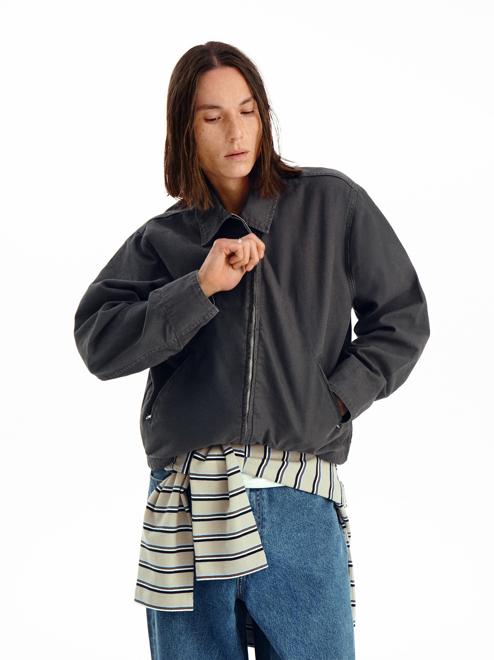 Sobrecamisa de manga larga versátil y robusta perfecta para el entretiempo. Confeccionada en tejido grueso, ofrece la resistencia y la estructura de una cazadora, pero con la versatilidad de una camisa. Su corte relaxed fit permite llevarla cómodamente sobre otras capas. Presenta un cuello camisero clásico, cierre de cremallera frontal y dos prácticos bolsillos laterales con cremallera. Ideal para un estilo casual con un toque utilitario.