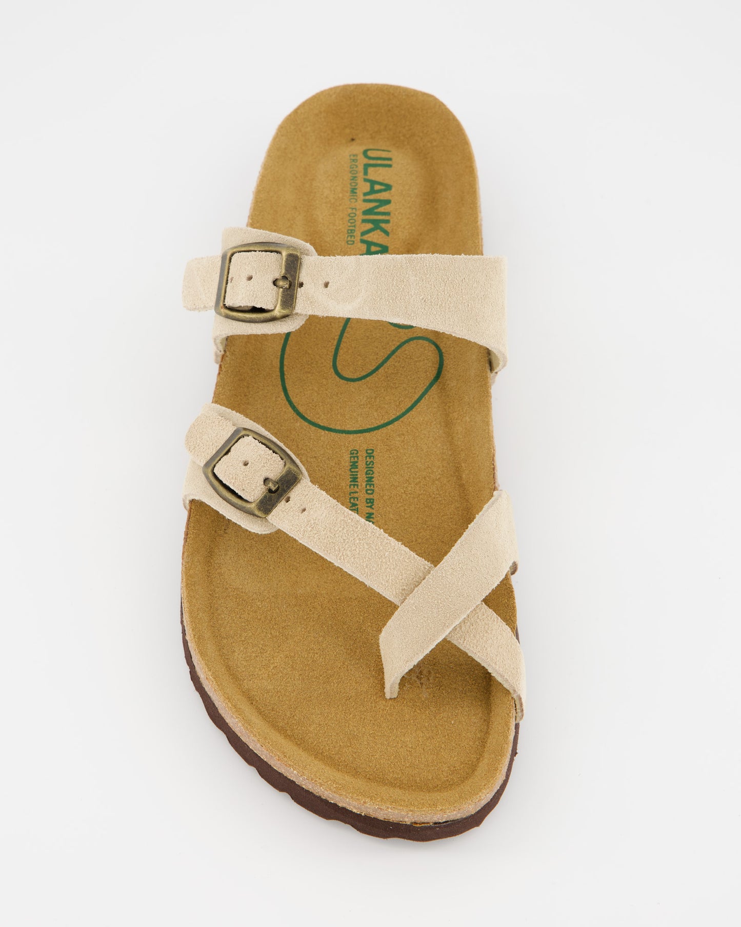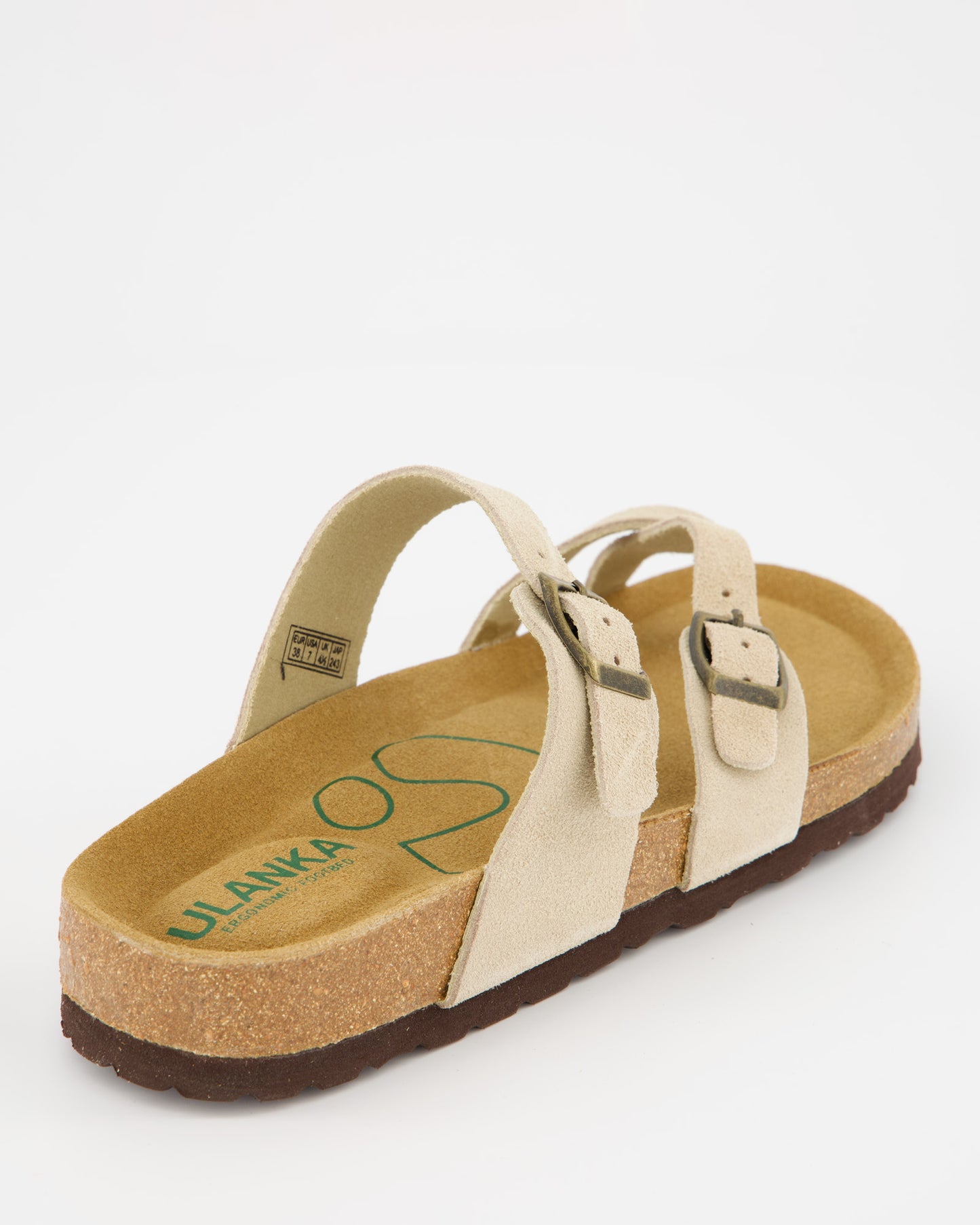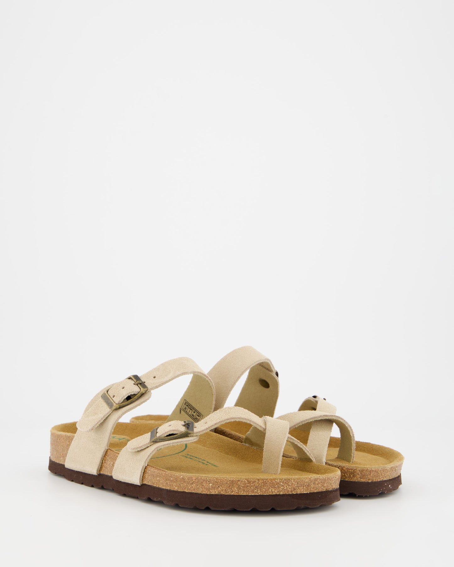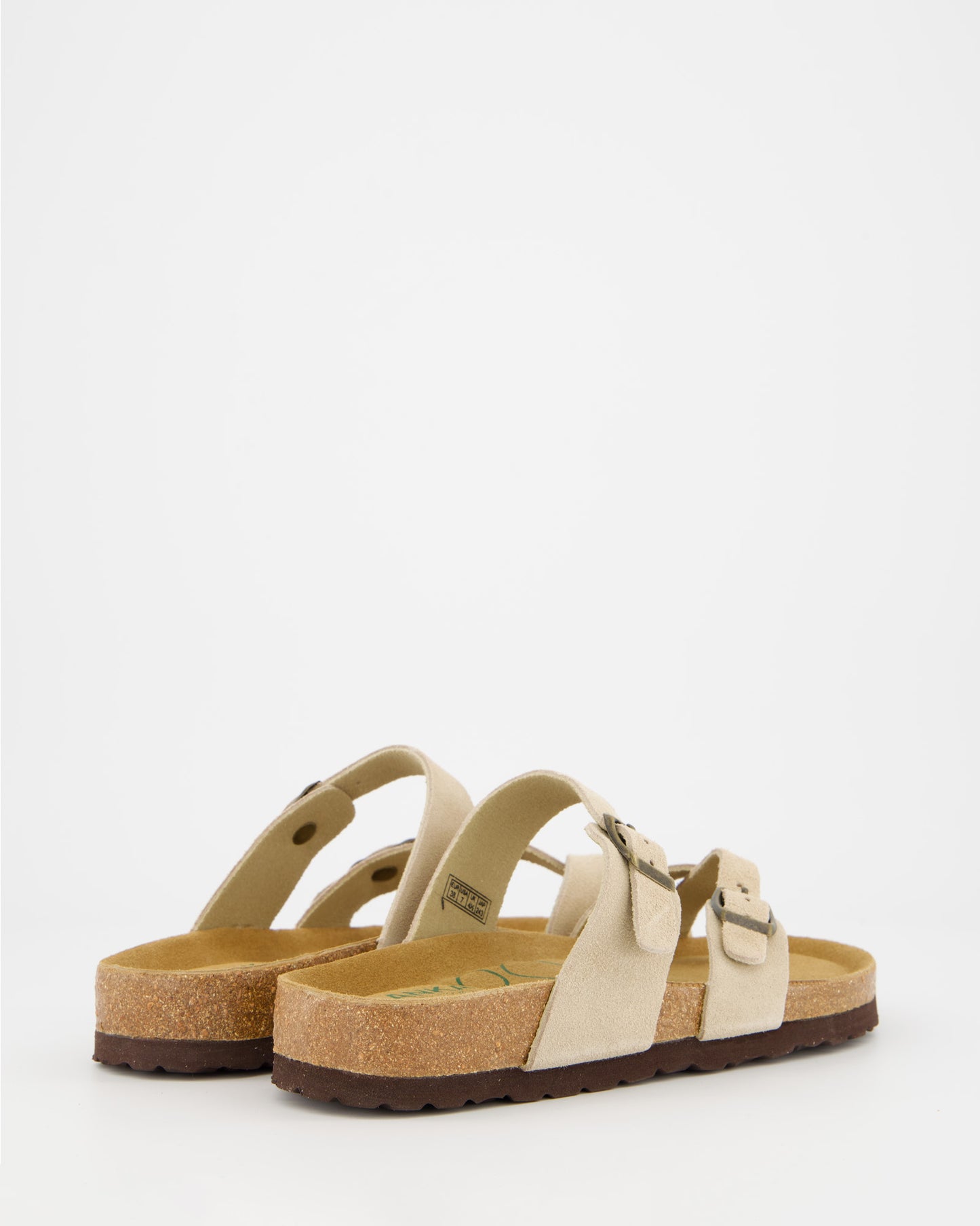 Sandalias confeccionadas en piel y materiales sintéticos. Cierre regulable con hebillas. Plantilla anatómica 100% reciclada. Suela de goma de 3 cm de altura.