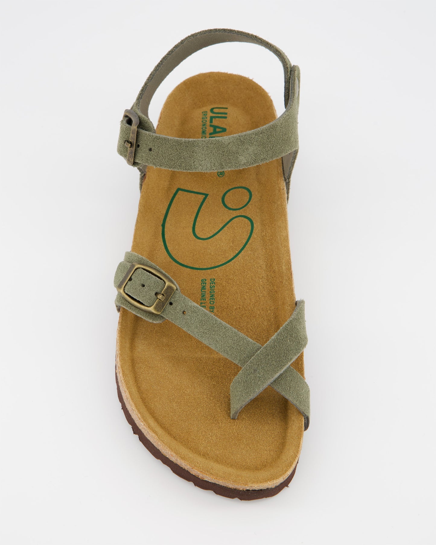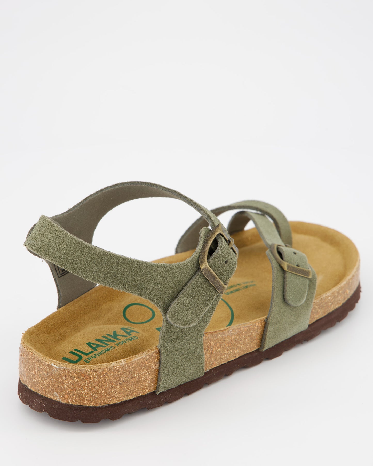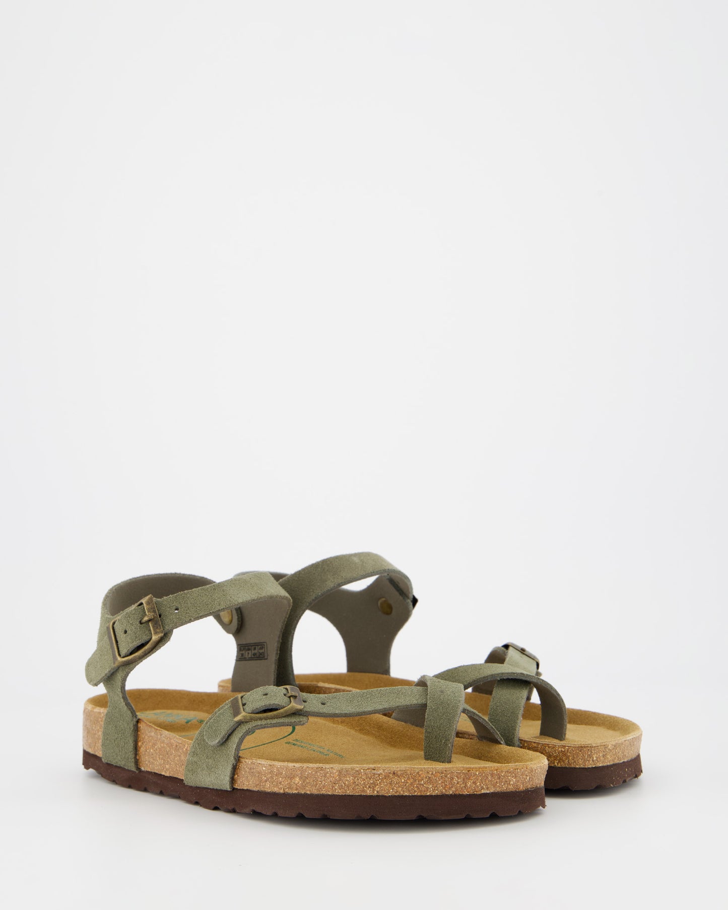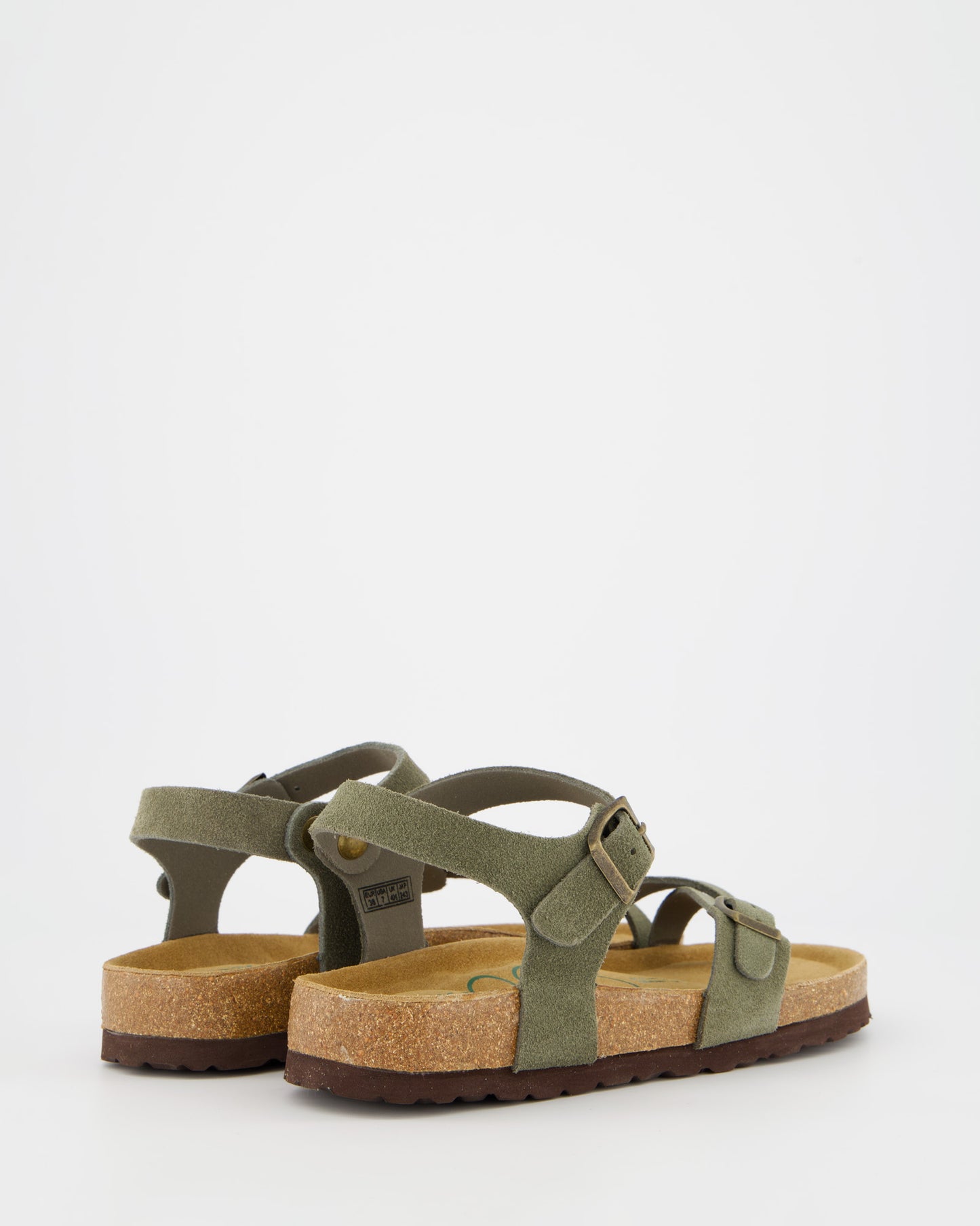 Sandalias confeccionadas en piel y materiales sintéticos. Cierre regulable con hebillas. Plantilla anatómica 100% reciclada. Suela de goma de 3 cm de altura.