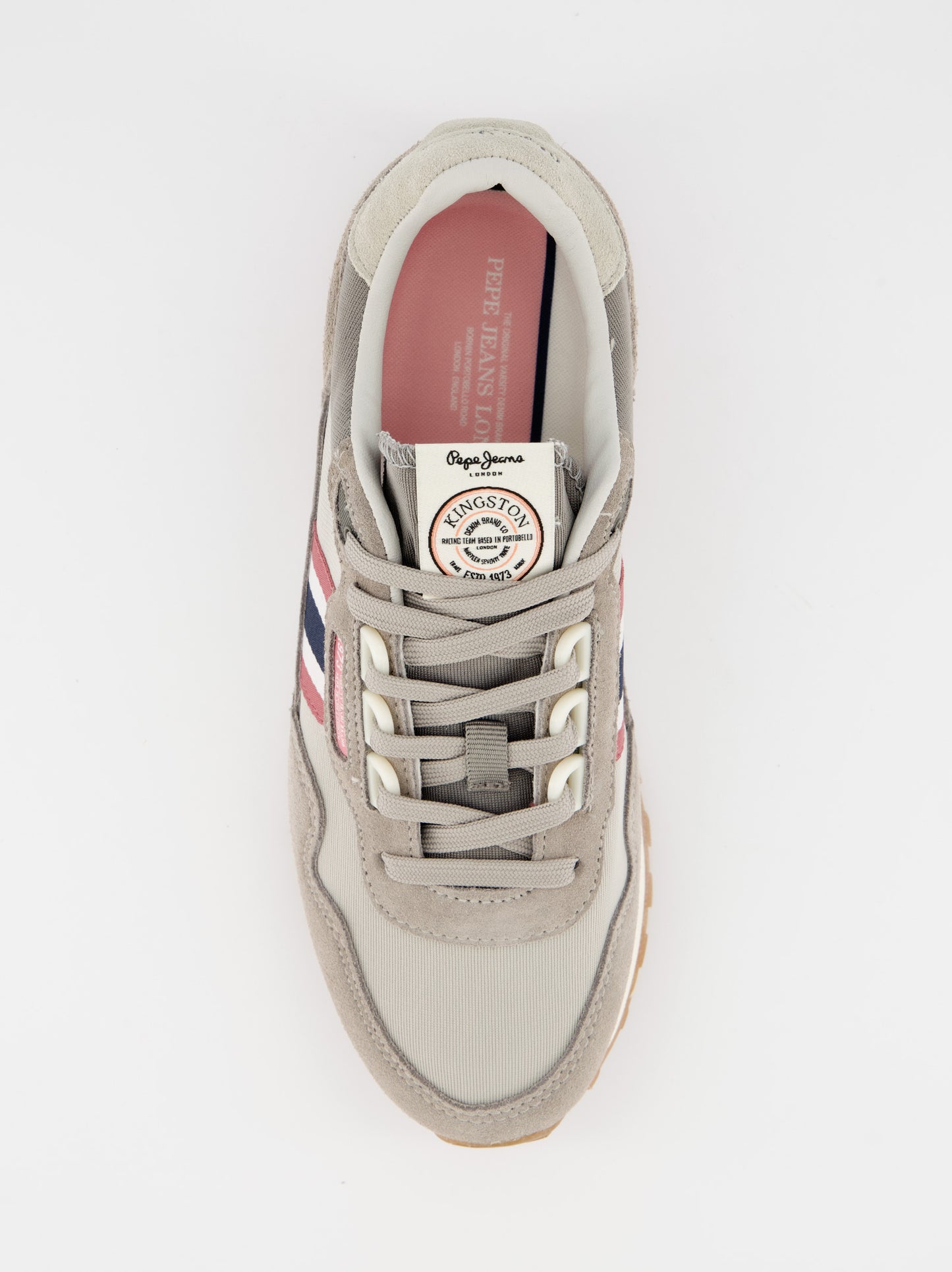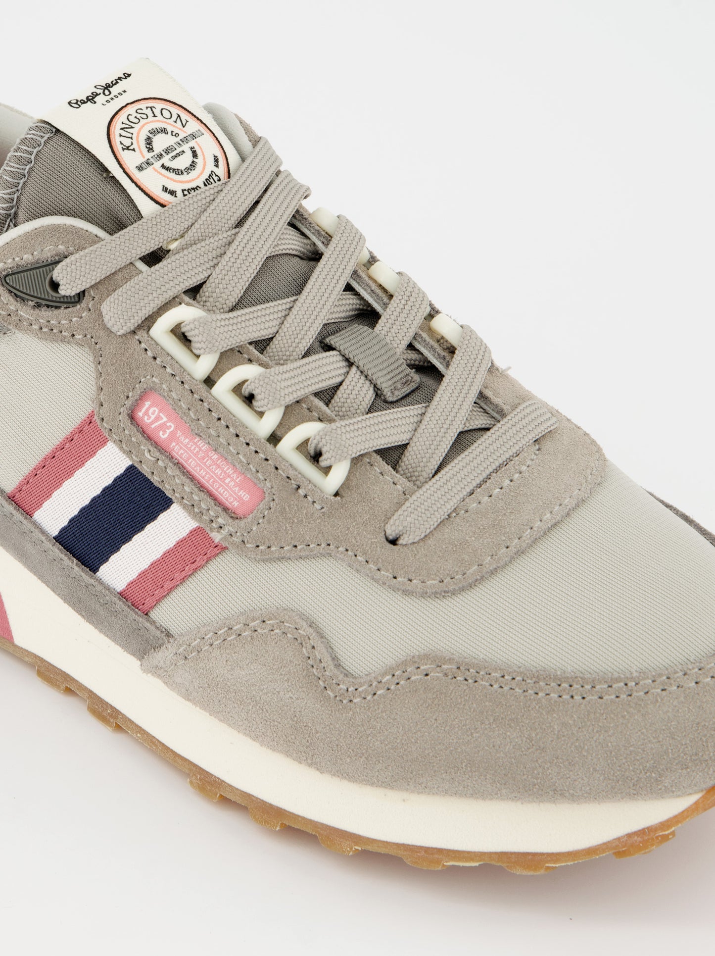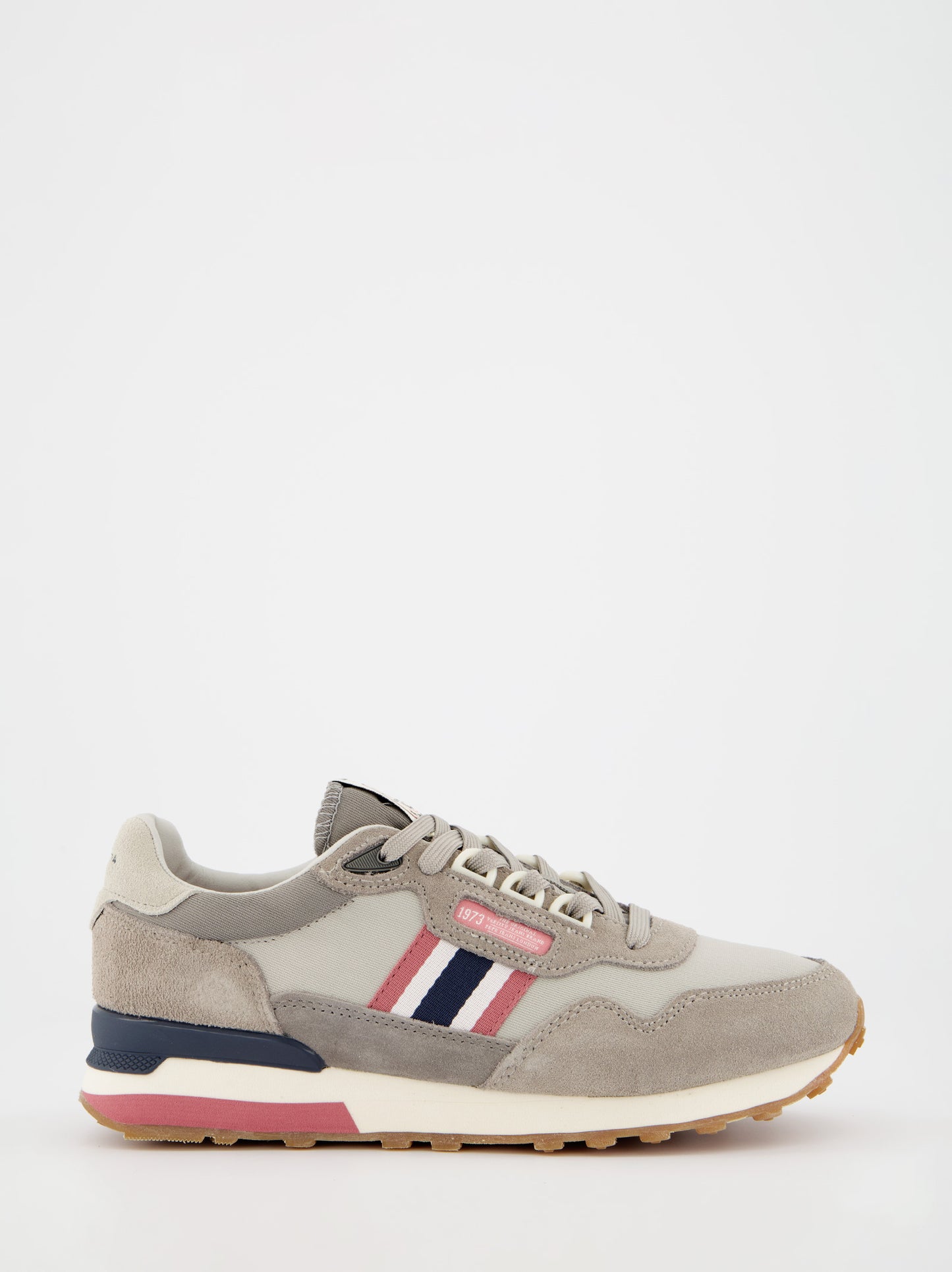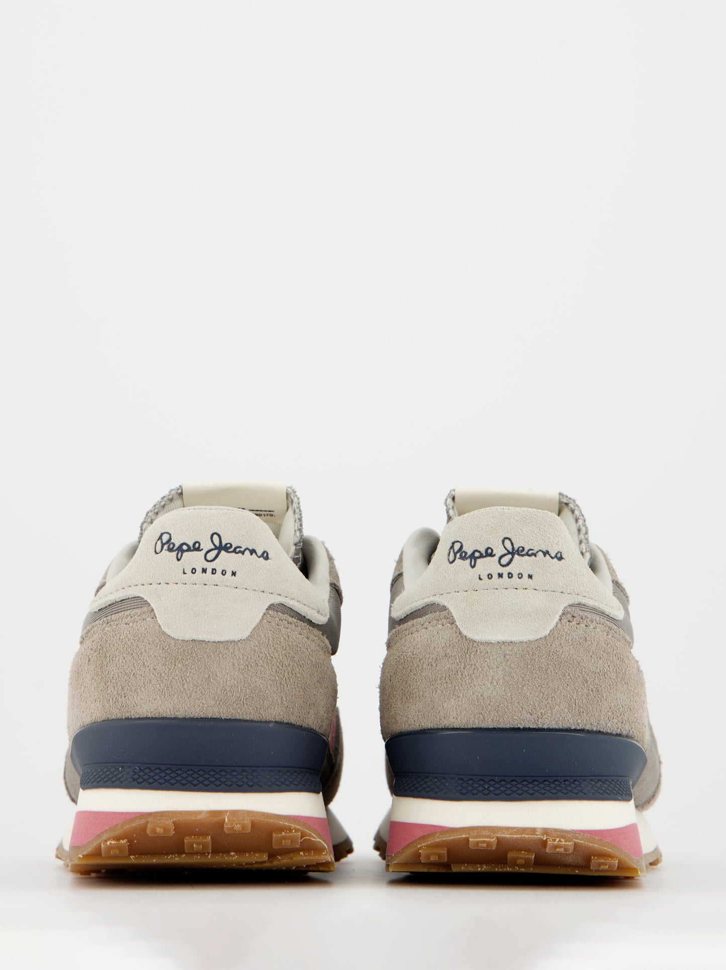 Zapatillas running en combinación de tejidos. Detalles de ante en puntera, cordonera y talón. Cierre de cordones con anillas en forma de D. Franja lateral con líneas diagonales tricolor. Logo PEPEJEANS grabado en talón. Estabilizador en el talón. Entresuela ultraligera en goma EVA bicolor. Suela exterior de caucho. Dimensiones: 27,50 cm x 9,50 cm x 10 cm.