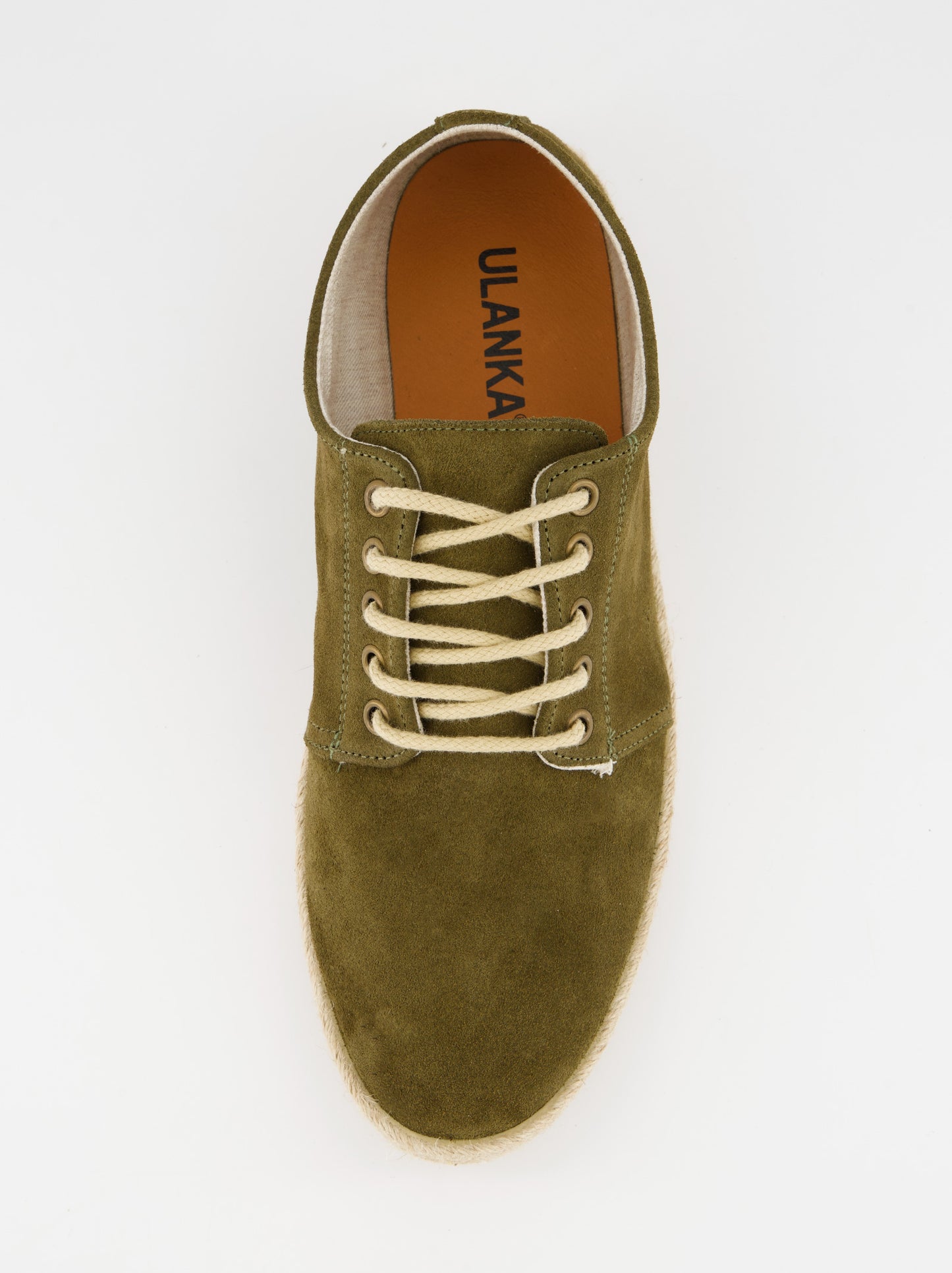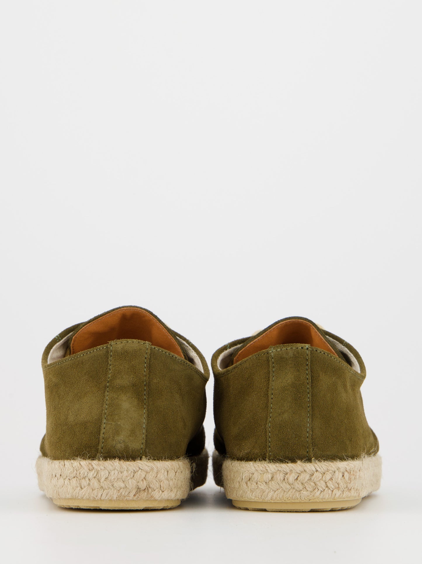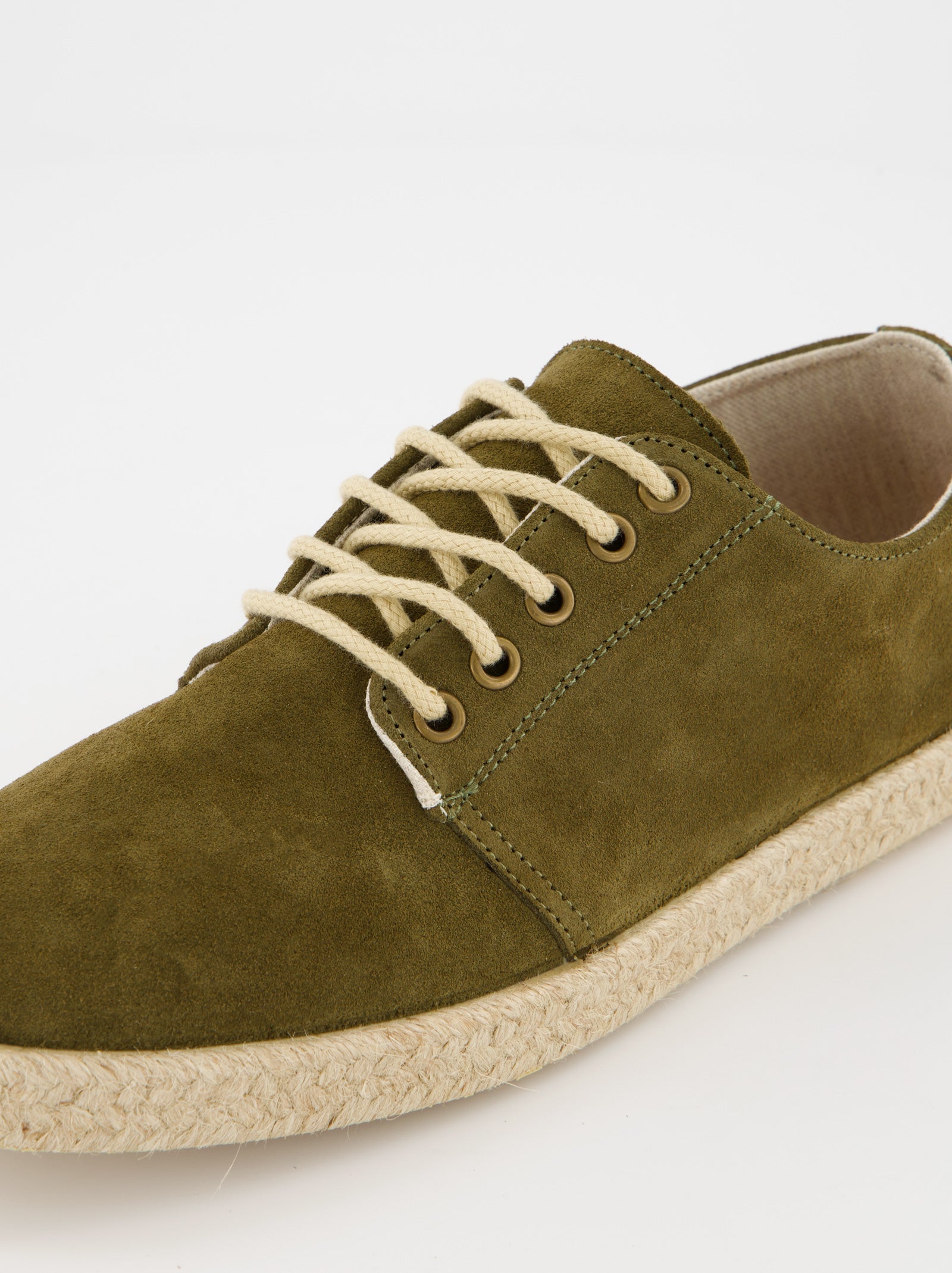 Zapatos de cordones fabricados en ante. Suela de esparto. Cierre con cordones. Tirador trasero. Fabricados en España.